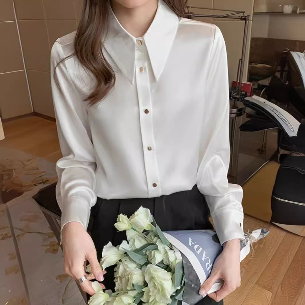 この「【超人気】サテンの白いシャツ」で、あなたの春秋スタイルをさらに魅力的に仕上げましょう!