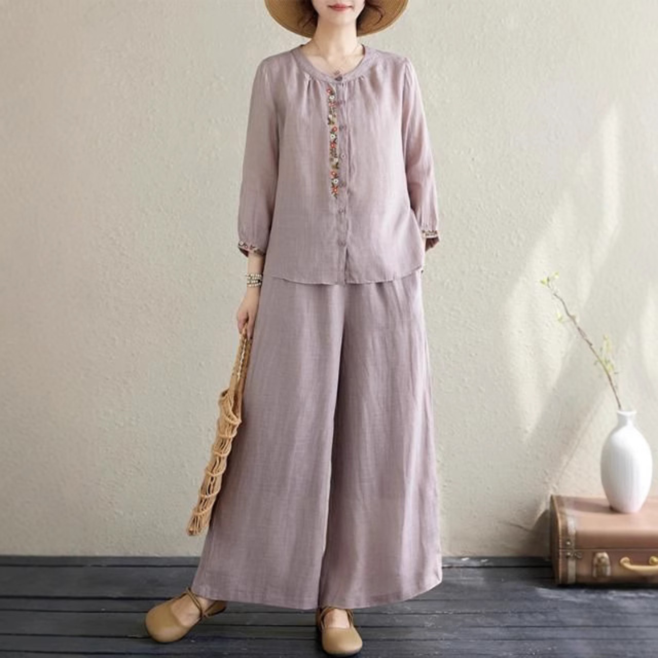 新作登場⭐ 夏にぴったりの「高級コットンリネンスーツ、女性用新作ファッション」が新たにラインアップに加わりました!このアイテムは、ナショナルスタイルのママシャツとワイドレッグパンツの2ピーススーツで、カジュアルからお出かけシーンまで幅広く活躍する一着です。引き立つ美しいシルエットと快適な着心地が、あなたの夏スタイルを華やかに演出します。