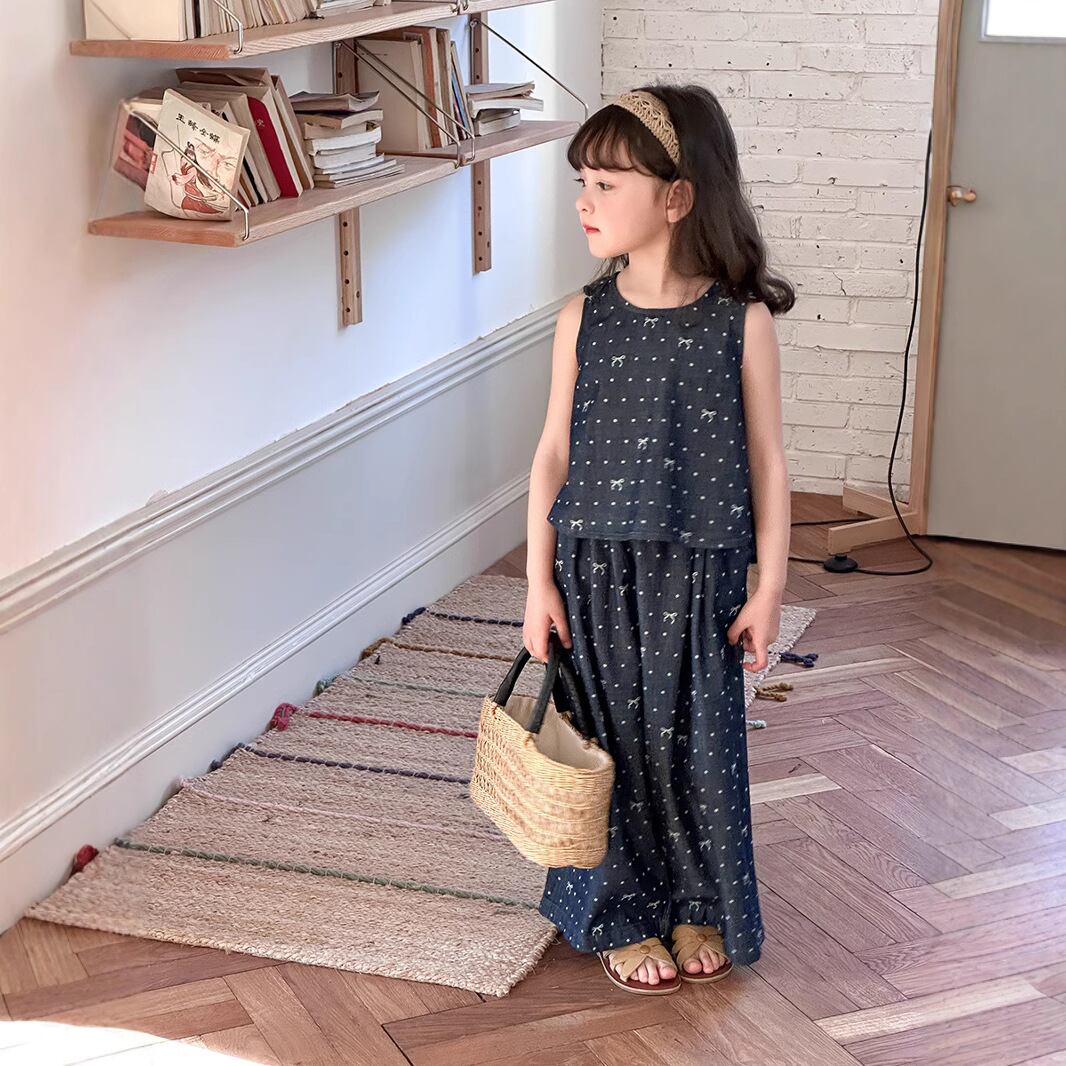 この【大人気】Amo Beibei 女の子の夏 スイート ドット柄 リボン 薄手 ソフト デニム ベスト ワイドレッグ パンツ ツーピース スーツで、素敵な夏のスタイルを楽しんでください!