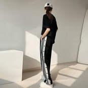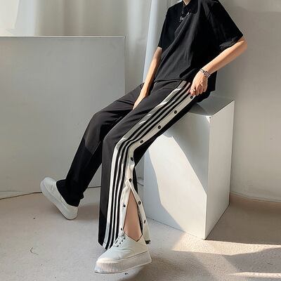【超人気】春と夏の女性のためのストリートブラストワイドレッグカジュアルスポーツパンツ、小さいサイズ、ハイウエスト、ハイライズ、スリミング、狭いサイドストライプ、ストレートパンツ | htgpartners