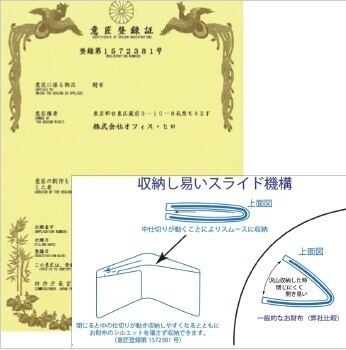 札入れ内部がスライドし、コンパクトにすっきり収納できる機構を取りれました(登録第1572381号)