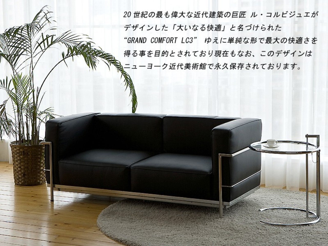 20世紀最も偉大な近代建築の巨匠 ル・コルビジュエの作品“LC3グランコンフォート”です。彼は建築においてもサヴォア邸、ロンシャン教会など数々の世界の建築史に残る作品を残してきた偉大な近代建築の巨匠です。 そして、この作品はグランコンフォート“GRAND COMFORT 「大いなる快適」”という意味で、単純な形で最大の快適さを得る事を目的とされており、金属パイプのフレームに革のクッションをはめ込むようにデザインされております。このLC3はコルビュジェの数あるデザインの中でも、大変評価が高い作品です。Mies、フランクロイドライトなどと並び、近代建築の20世紀の3大巨匠のひとり ル・コルビジュエの20世紀不朽の名作”LC3ソファ”をご体感して頂ければと思います。