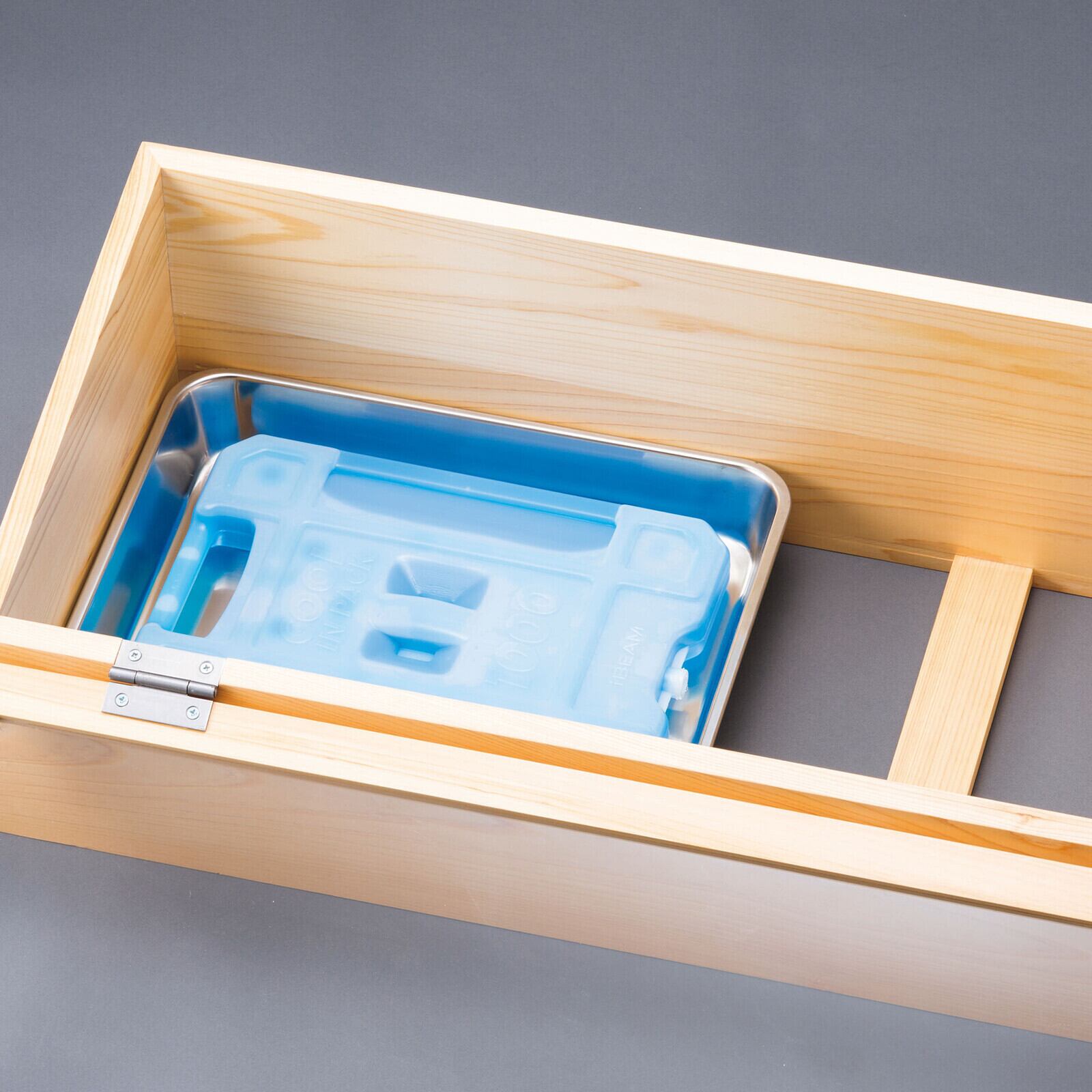 桧・ネタ箱傾斜型(長)/目皿・蓋・ステンレスバット付<日本製>
