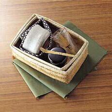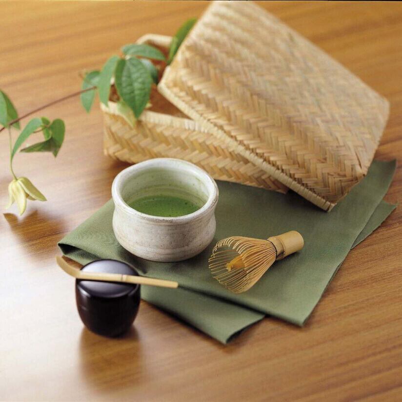 抹茶の道具を、持ち運びに便利な竹かごのケースに収めました。