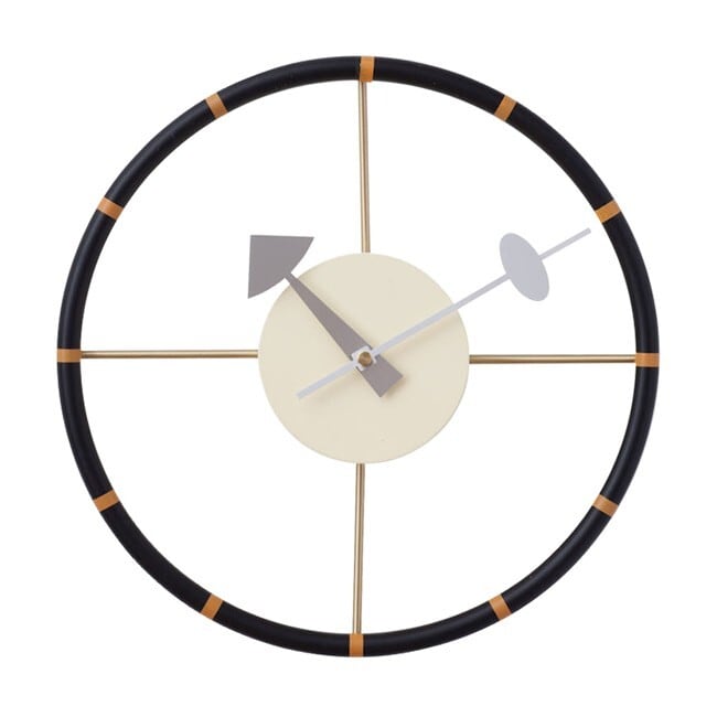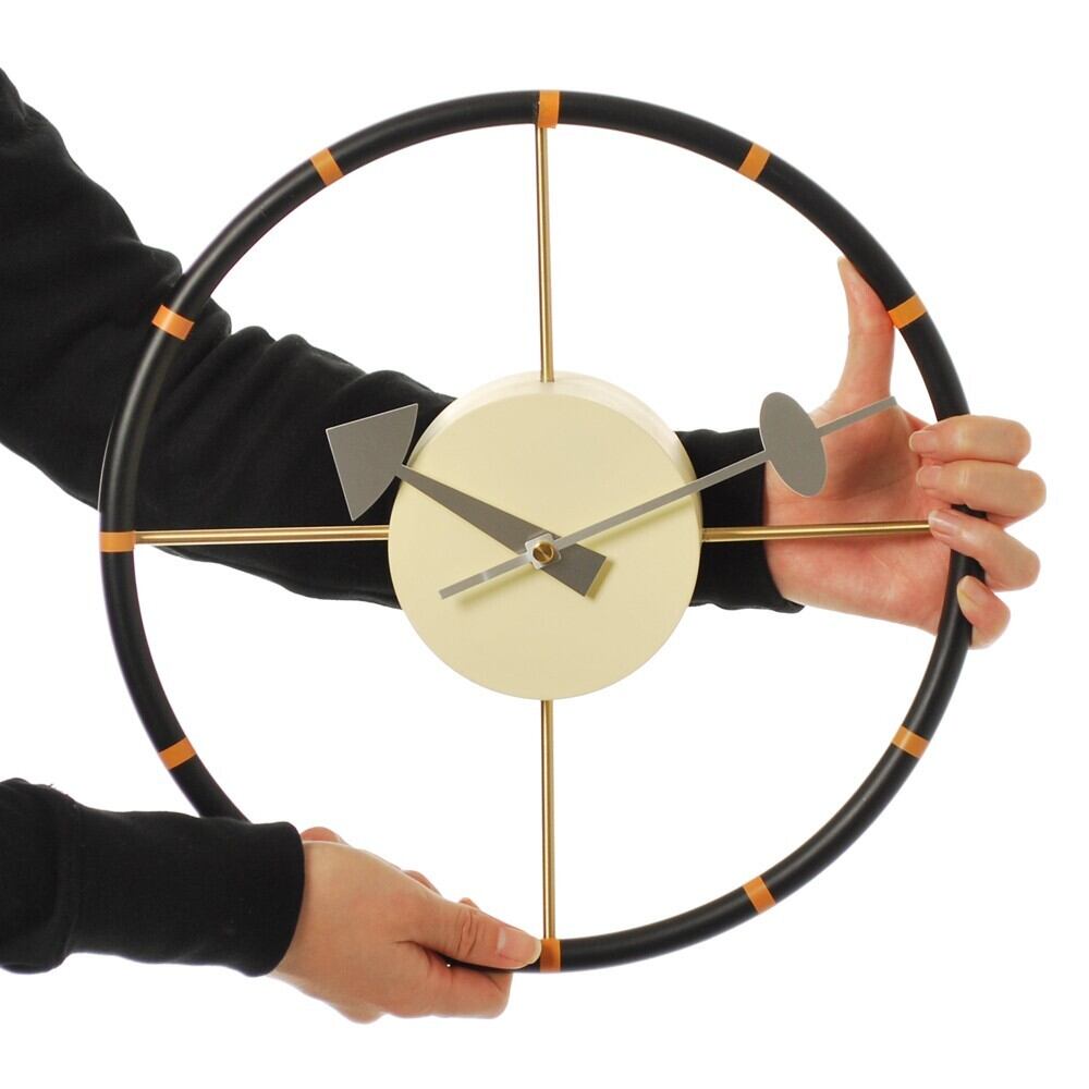 ステアリングクロックは1950年代にジョージ・ネルソン(George Nelson)によってデザインされました。 その名の通り、車のハンドルをモチーフにしたデザインです。 握りが細く大型車の様に大きな経のハンドルは、当時のアメ車のステアリングを思い起こさせます。 ビンテージカーを思わせる華奢なラインで重い印象が無く、時刻ポイントにはオレンジが配されて視認性への配慮もしっかりとデザインされています。 ネルソンクロックとも呼ばれる一連のシリーズは、その特徴的な形態からデザインの古典的なアイコンともなっています。 時計としての機能だけではなく見て楽しいインテリアのアクセントとしても人気があります。 ミッドセンチュリーを彷彿とさせるアメリカンテイストのお部屋にはもちろん、モダンなテイストのインテリアにもどんなスタイルにもマッチします。