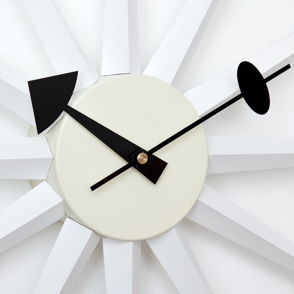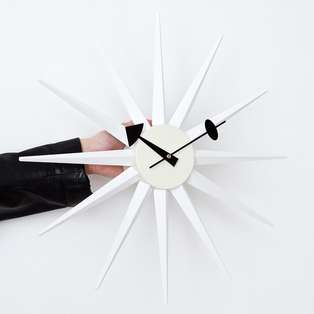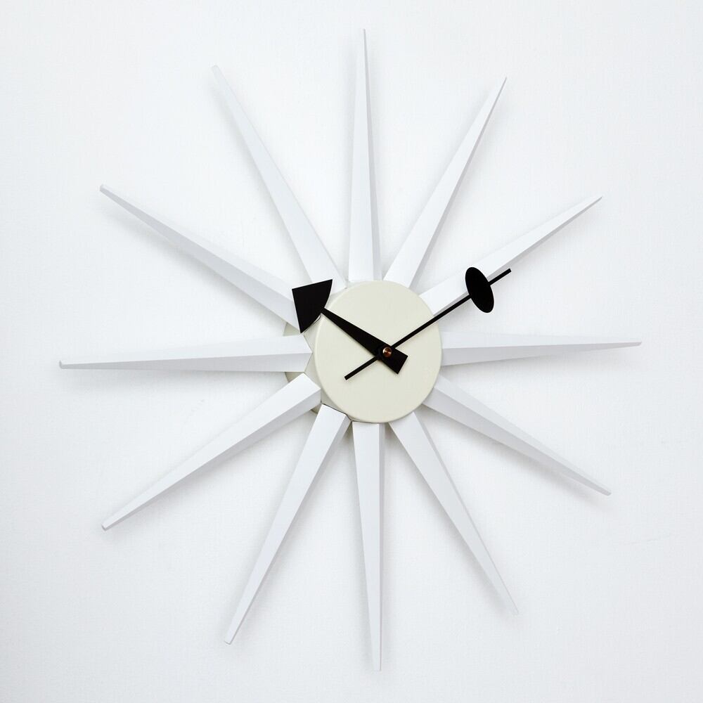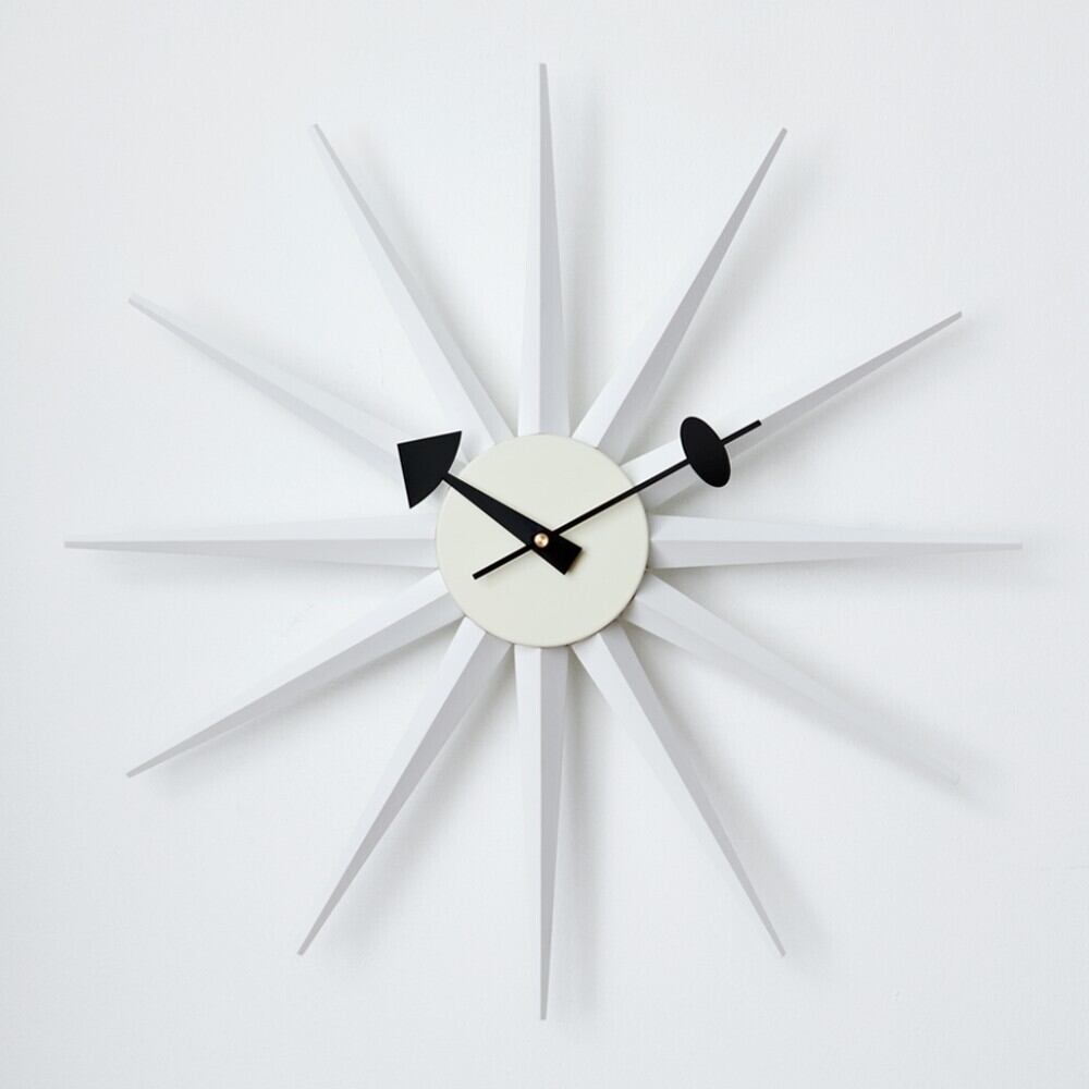 サンバーストクロックは1957年にジョージ・ネルソン(George Nelson)によって製作されました。 太陽が光輝くような様をモチーフにしたような、遊び心あふれるデザインとなっております。 突き出すような光の線は、カラフルにペイントされており見るものを楽しくさせてくれます。 また照明によって出来る影が、白い壁に投影されるとインテリアのポイントとなります。 ネルソンクロックとも呼ばれる一連のシリーズは、その特徴的な形態からデザインの古典的なアイコンともなっています。 時計としての機能だけではなく、見て楽しいインテリアのアクセントとしても非常に人気があります。 ミッドセンチュリーを彷彿とさせるアメリカンテイストのお部屋にはもちろん、モダンなテイストのインテリアにもどんなスタイルにもマッチします。
