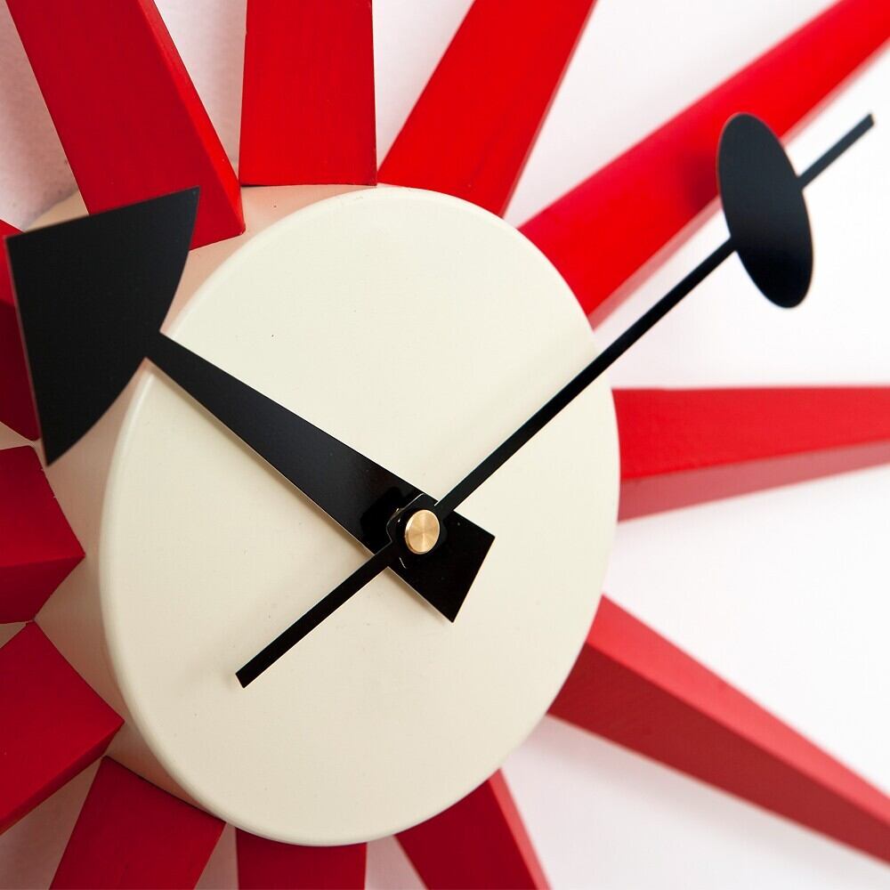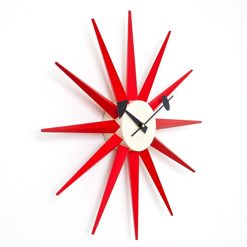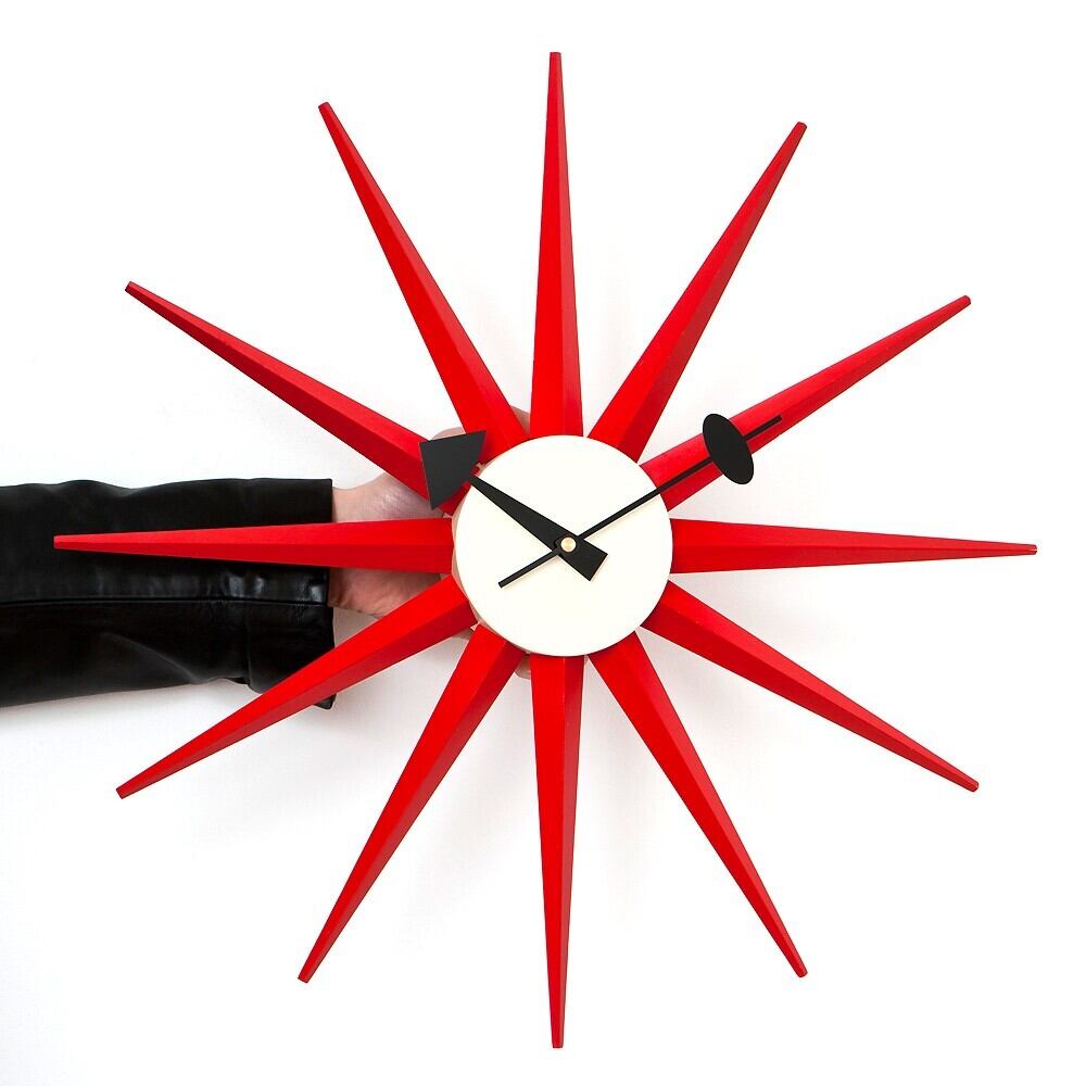 サンバーストクロックは1957年にジョージ・ネルソン(George Nelson)によって製作されました。 太陽が光輝くような様をモチーフにしたような、遊び心あふれるデザインとなっております。 突き出すような光の線は、カラフルにペイントされており見るものを楽しくさせてくれます。 また照明によって出来る影が、白い壁に投影されるとインテリアのポイントとなります。 ネルソンクロックとも呼ばれる一連のシリーズは、その特徴的な形態からデザインの古典的なアイコンともなっています。 時計としての機能だけではなく、見て楽しいインテリアのアクセントとしても非常に人気があります。 ミッドセンチュリーを彷彿とさせるアメリカンテイストのお部屋にはもちろん、モダンなテイストのインテリアにもどんなスタイルにもマッチします。
