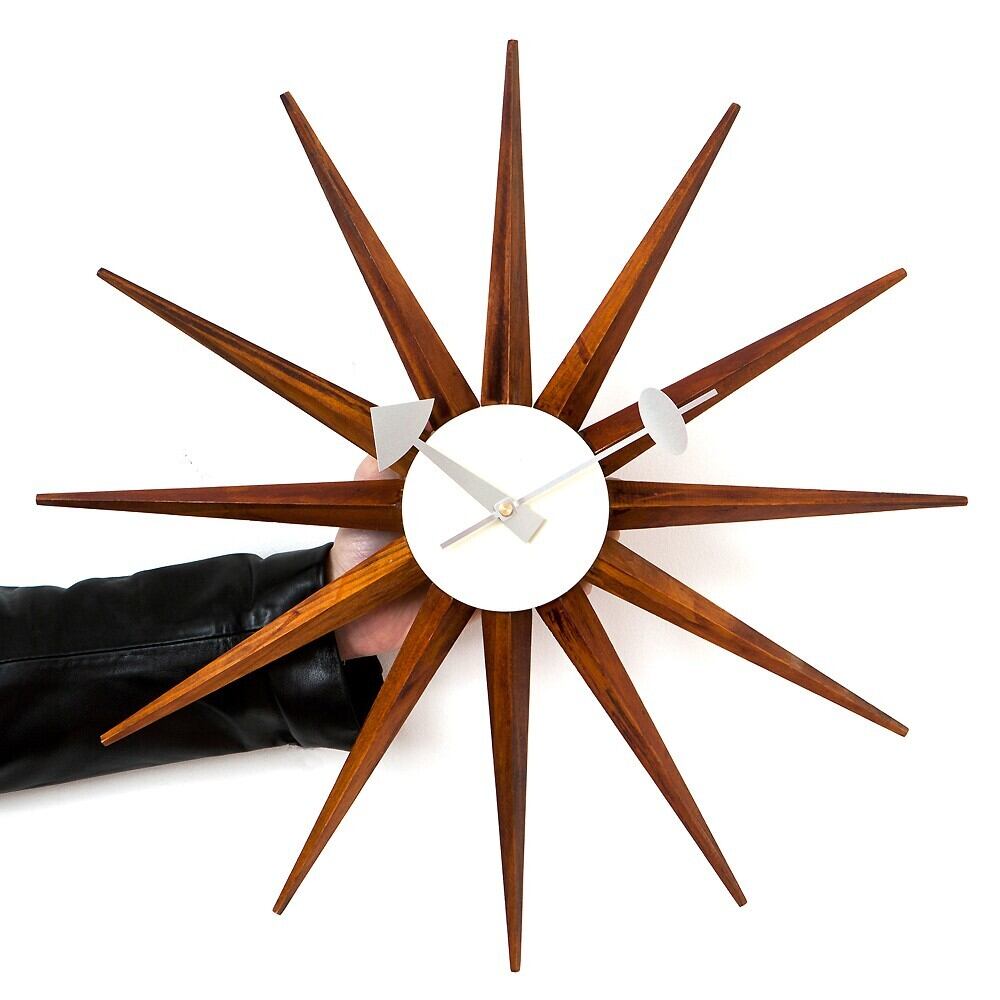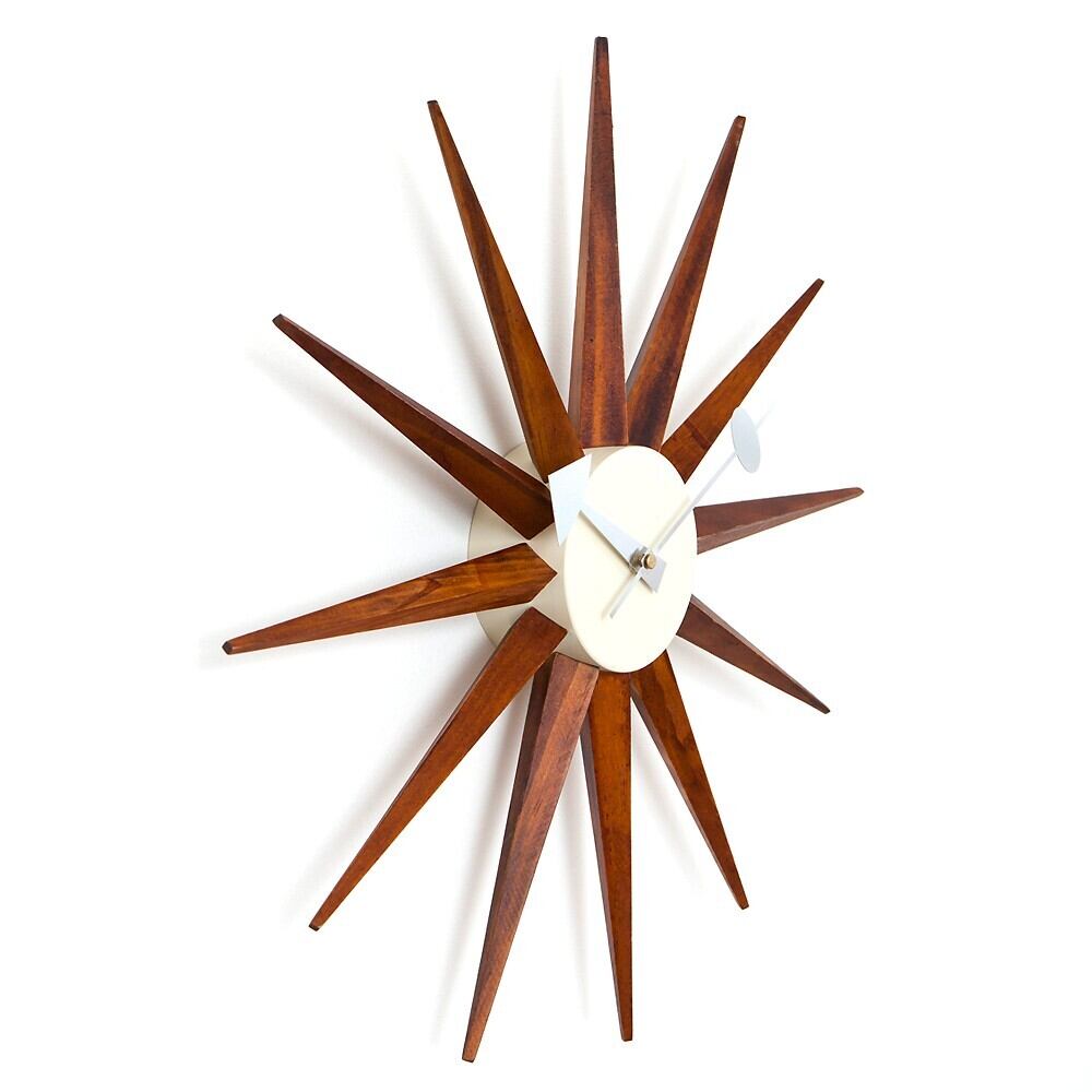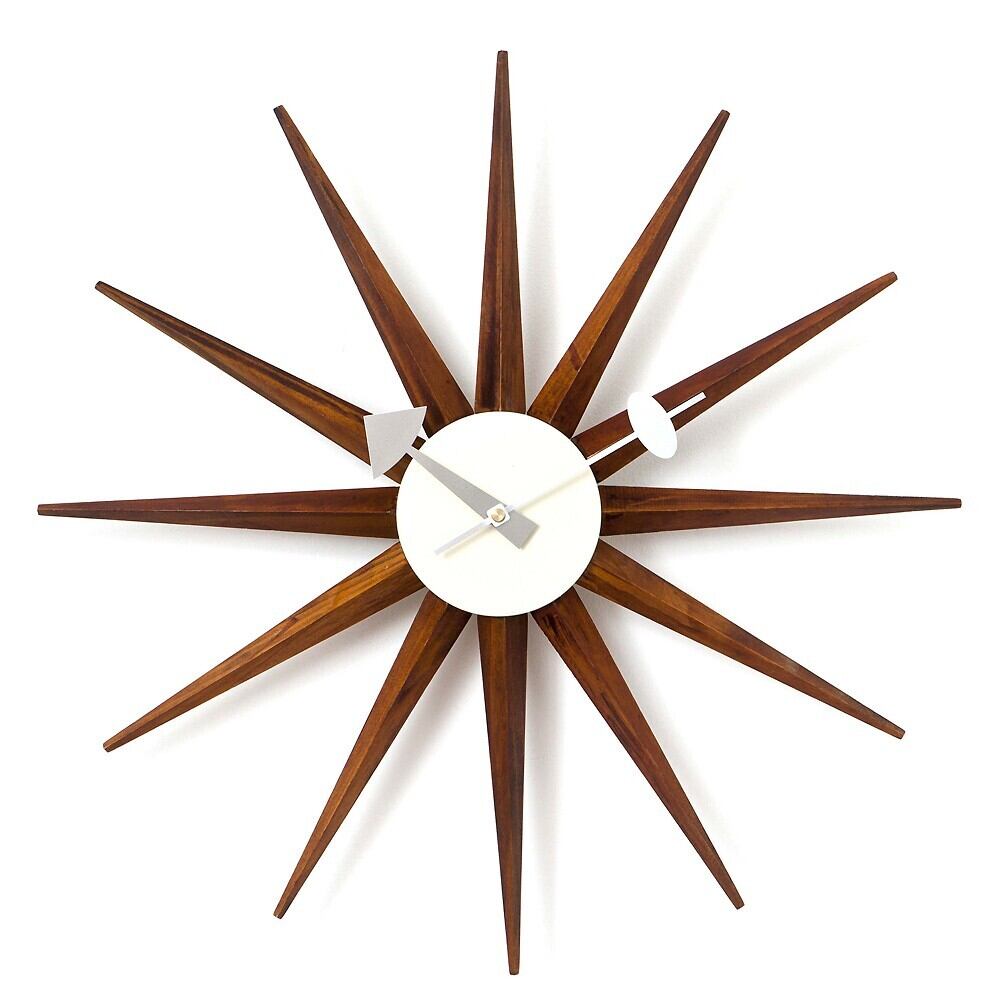 サンバーストクロックは1957年にジョージ・ネルソン(George Nelson)によって製作されました。 太陽が光輝くような様をモチーフにしたような、遊び心あふれるデザインとなっております。 突き出すような光の線は、カラフルにペイントされており見るものを楽しくさせてくれます。 また照明によって出来る影が、白い壁に投影されるとインテリアのポイントとなります。 ネルソンクロックとも呼ばれる一連のシリーズは、その特徴的な形態からデザインの古典的なアイコンともなっています。 時計としての機能だけではなく、見て楽しいインテリアのアクセントとしても非常に人気があります。 ミッドセンチュリーを彷彿とさせるアメリカンテイストのお部屋にはもちろん、モダンなテイストのインテリアにもどんなスタイルにもマッチします。