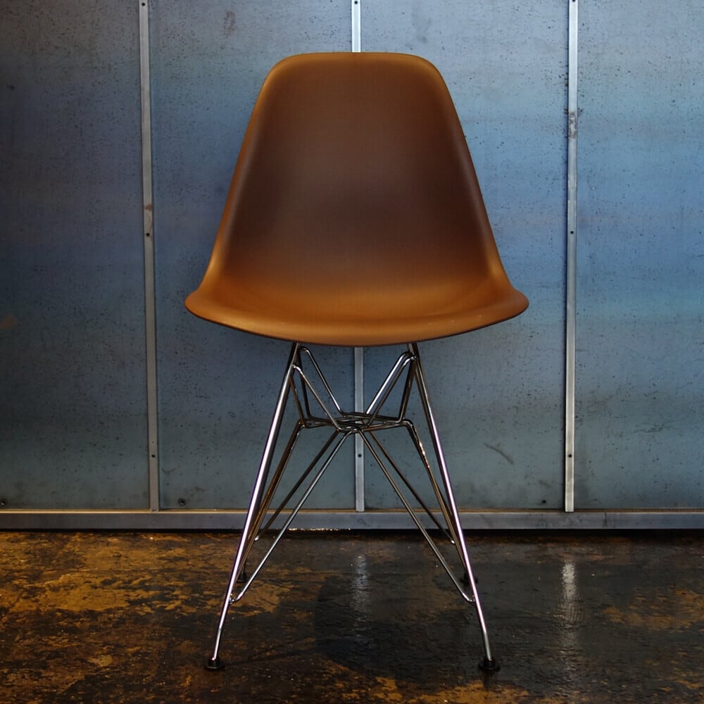60〜70年代のモダンデザインのパイオニアとして活躍したチャールズ&レイ イームズ。こちらはイームズ不朽の名作シェルチェアです。ちなみにシェルとは英語で貝殻という意味を持ち、貝殻のような曲面で構成されたチェアになります。誕生したのは1948年、MoMAが開催した家具の国際コンペでした。イームズ夫妻が初めて発表した成型プラスチック製の椅子は、アメリカのデザイナーが消費者のニーズに応えた最初の作品として大きな支持を獲得しました。こちらは当時のオリジナルを忠実に再現したシェル一体構造となっており、とても軽く耐久性にも優れています。