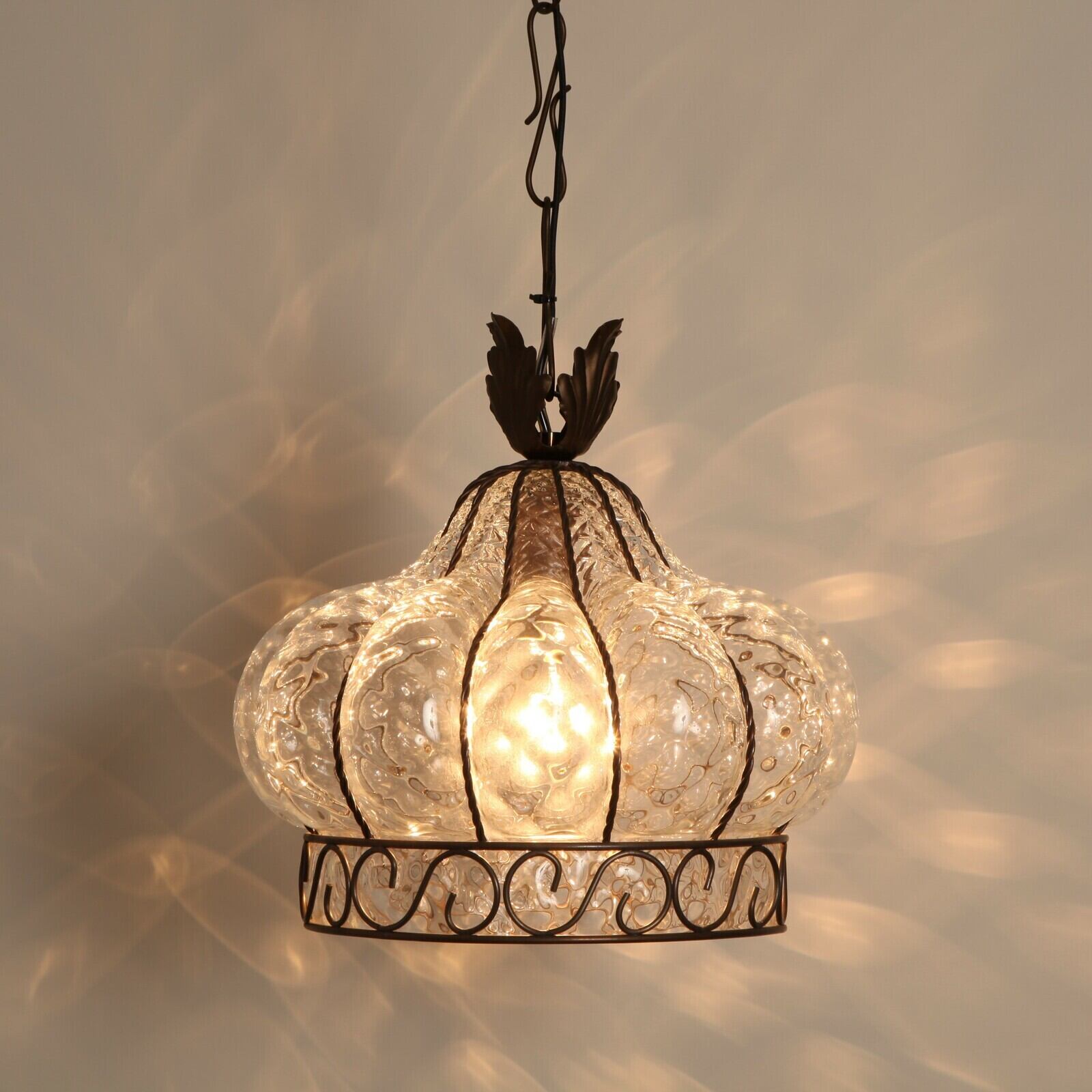 イタリアムラノ島 (ヴェネチア) の工房にて、一つ一つ職人の手によって作られています。スチールの枠にガラスを吹き込む伝統的なこの工法は、ガラスに立体感が生まれとても存在感のあるガラス製品となります。職人の吹きガラスによって作られるこのガラスには、光の拡散を生み出す細工が施されています。そのため点灯時に天井に映り込む光の陰影はとても幻想的です。伝統的なこちらのデザインは古くから愛されています。クリアーガラスのこちらの商品はより明るく感じさせる、透明感のある商品です。ダイニングテーブル上などに配置し低く吊ることで灯りを楽しむことができます。