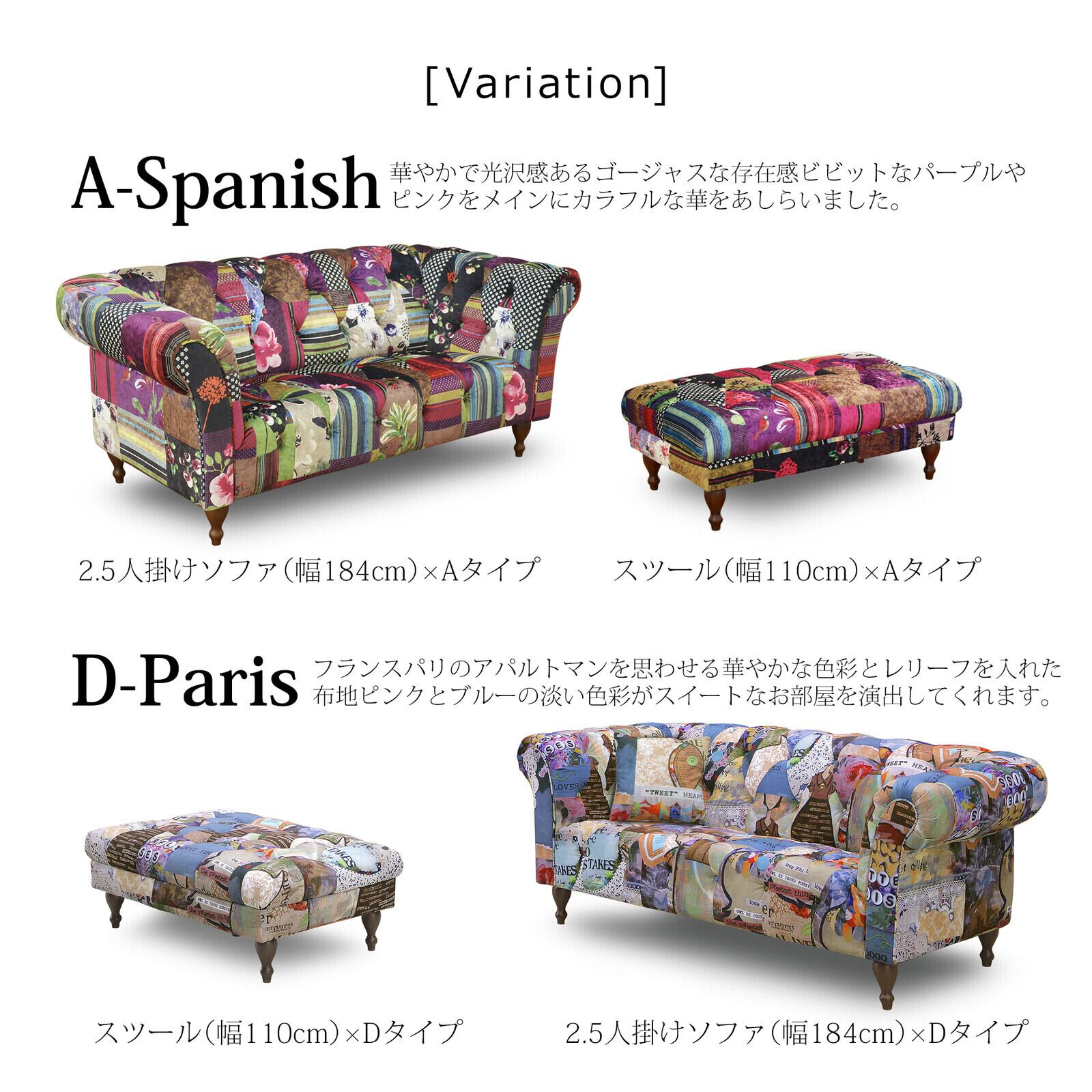 印象的なパッチワーク柄と、クラシカルなボタン留めのディテールが目を引く「Adam(アダム)シリーズ」。ヨーロピアンな佇まいと遊び心あふれる色使いが融合した、華やかで個性的な2.5人掛けソファです。