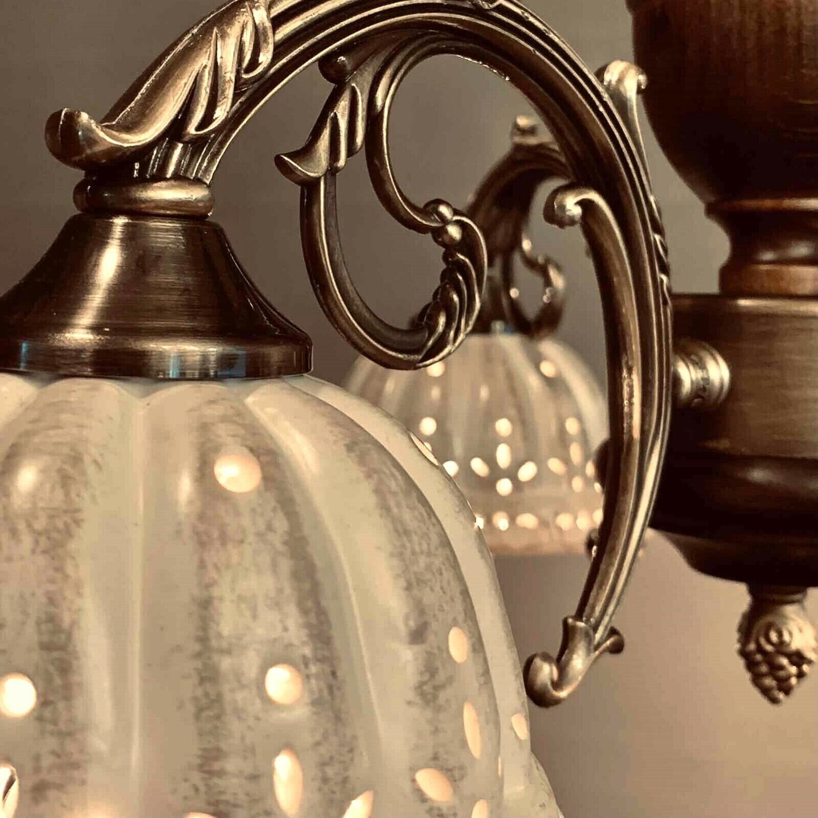 鋳物アームにイタリア製の陶器シェードを合わせました。デザインされた複数の小穴から漏れる灯りは優しく、空間に陰影を創り出します。陶器シェード表面にはエイジング塗装を施してあり、落ち着いた雰囲気のシャンデリアです。本体の木にはブナ材を使用し、国内にて挽き物にて加工して製作しております。ご希望により直付け (シーリングタイプ) に加工も可能です。