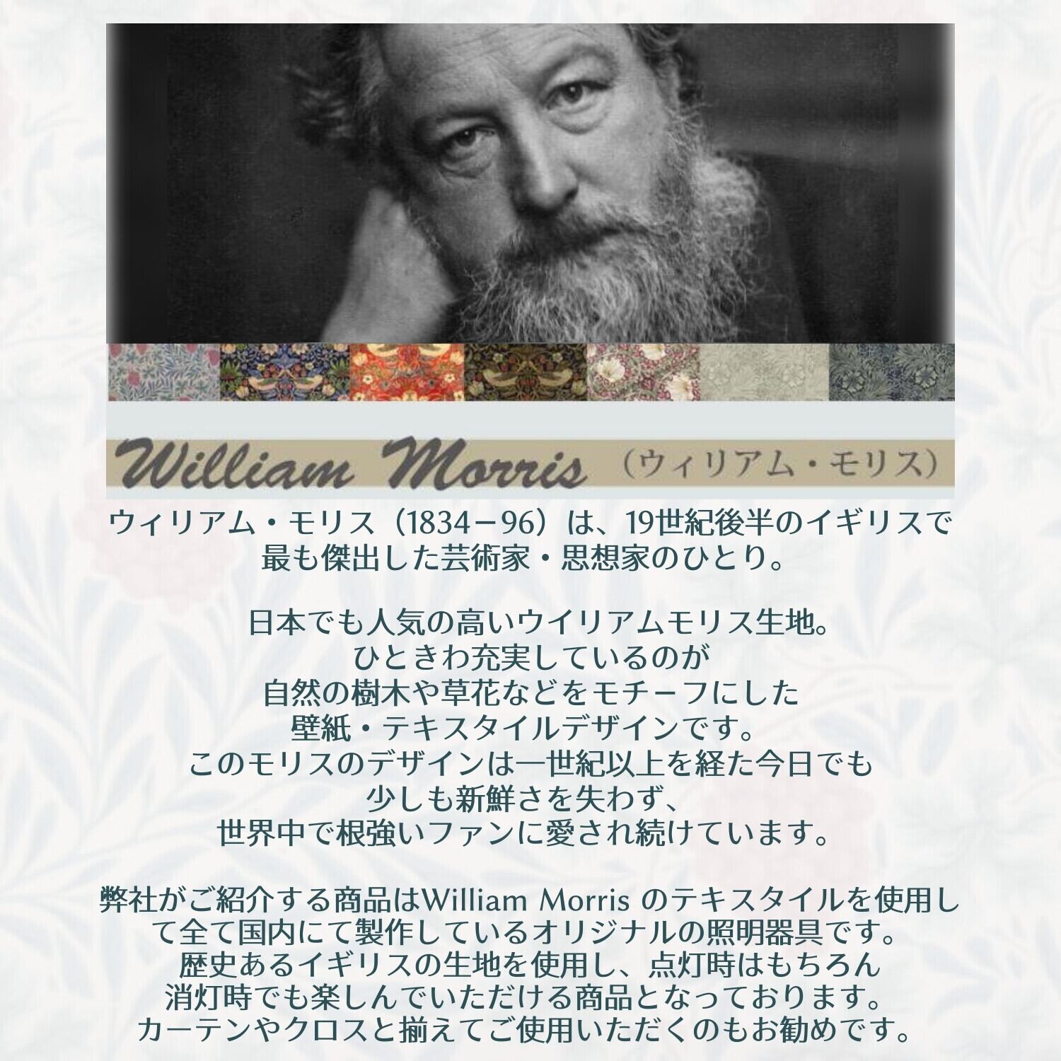 「モダンデザインの父」とも呼ばれ、世界はもちろん、日本においても全国各地の美術館で幾度となく展示会が開催されるなど、根強いファンが多いウィリアム・モリス。自然の樹木や草花などをモチーフにしたオリジナルの照明を取り扱っております。ウィリアム・モリスの生地を使用したここだけにしかないオリジナルの商品です。