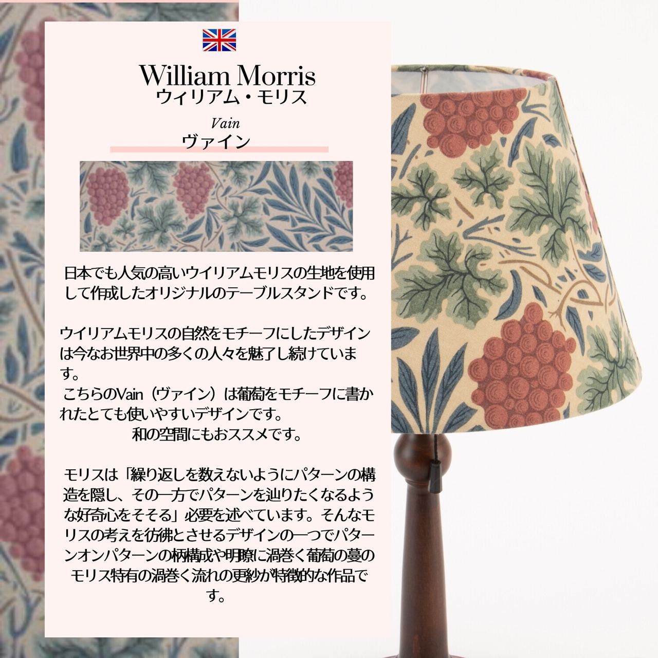 日本でも人気の高いウイリアムモリスの生地を使用して作成したオリジナルのテーブルスタンドです。