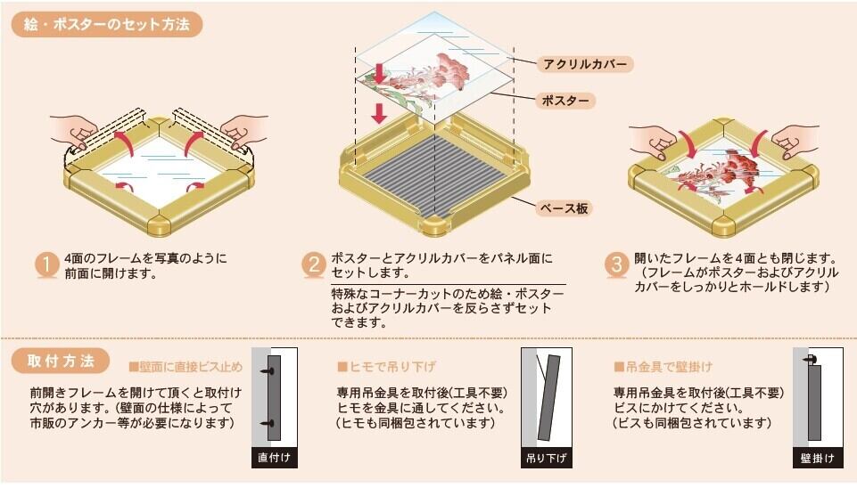 前開きフレームでポスターの入替が簡単!特殊なコーナーカットでポスターやアクリル板をセットする際、曲げたり反らせたりする手間が不要です。