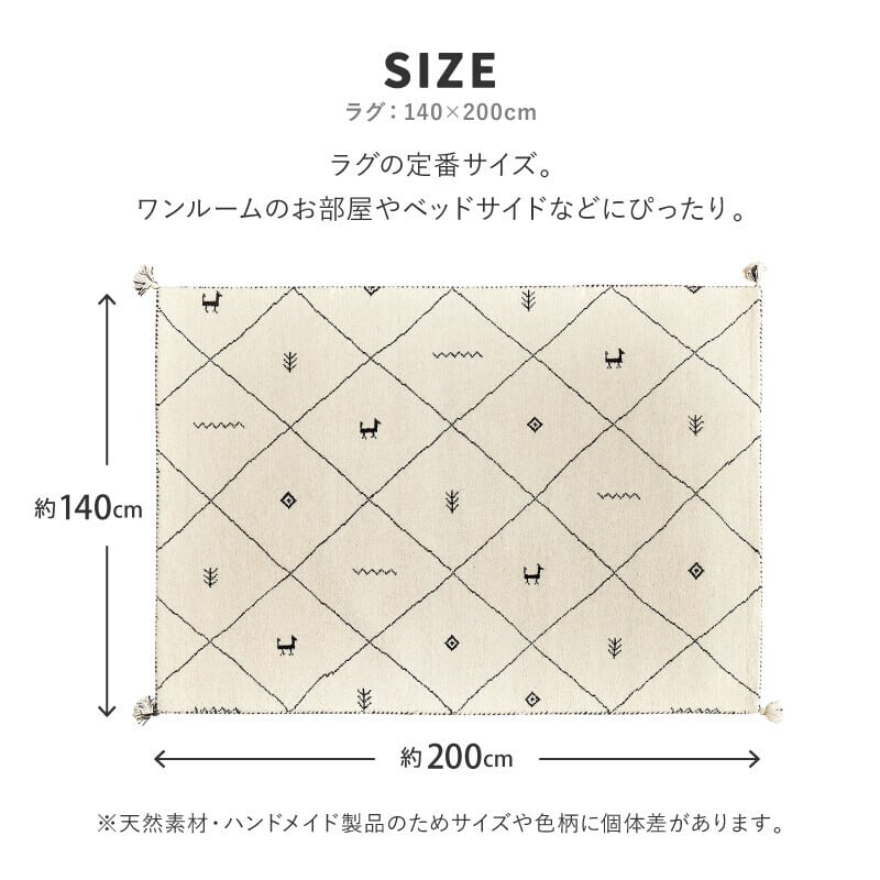 ウ-ル素材は暖かく冬に適しているイメ-ジがありますが、温度差の激しい環境で育った羊から取れる羊毛は、保温性と湿度を調節する機能に優れています。夏の湿気にも適しておりオ-ルシ-ズンご使用いただける素材です。しっかりとした密度と厚みで、ふかふかな踏み心地。裏面も同素材で床にやさしい仕様です。四隅にはタッセルをあしらい、愛らしさをプラスしました。