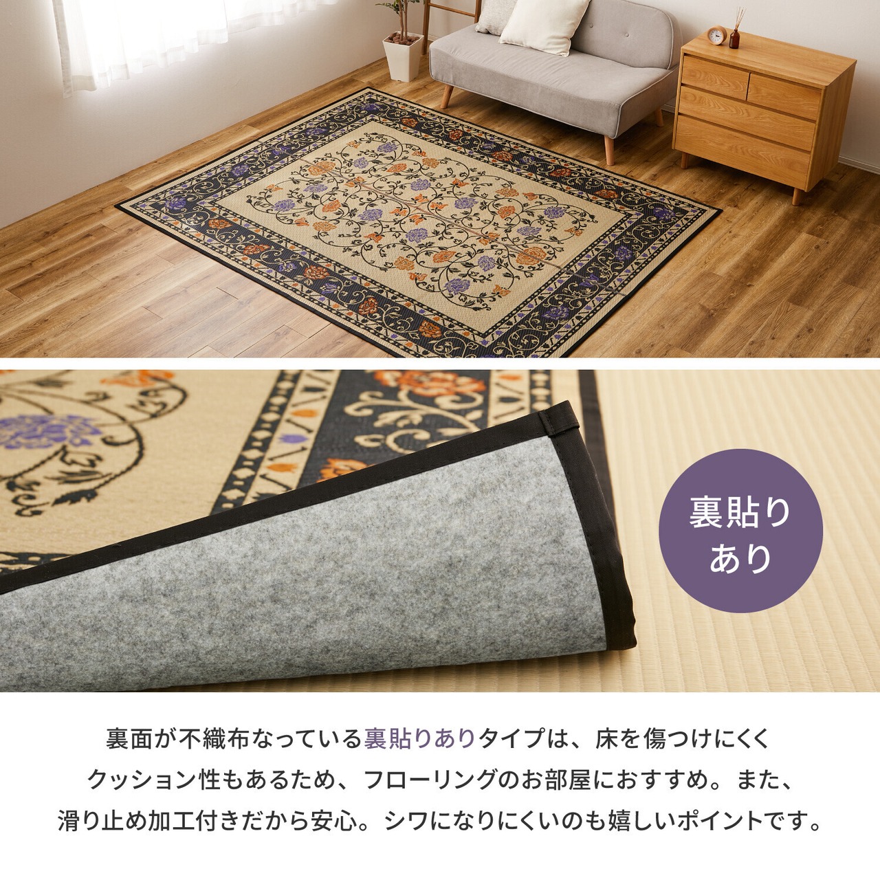 裏面は、不織布に滑りにくい加工を施した裏貼りタイプです。