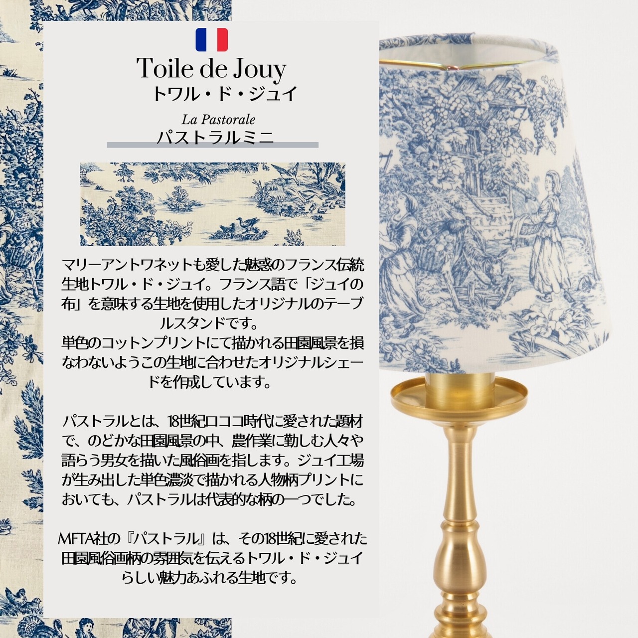 マリーアントワネットも愛した魅惑のフランス伝統生地トワル・ド・ジュイ。フランス語で「ジュイの布」を意味する生地を使用したオリジナルのテーブルスタンドです。単色のコットンプリントにて描かれる田園風景を損なわないようこの生地に合わせたオリジナルシェードを作成しています。