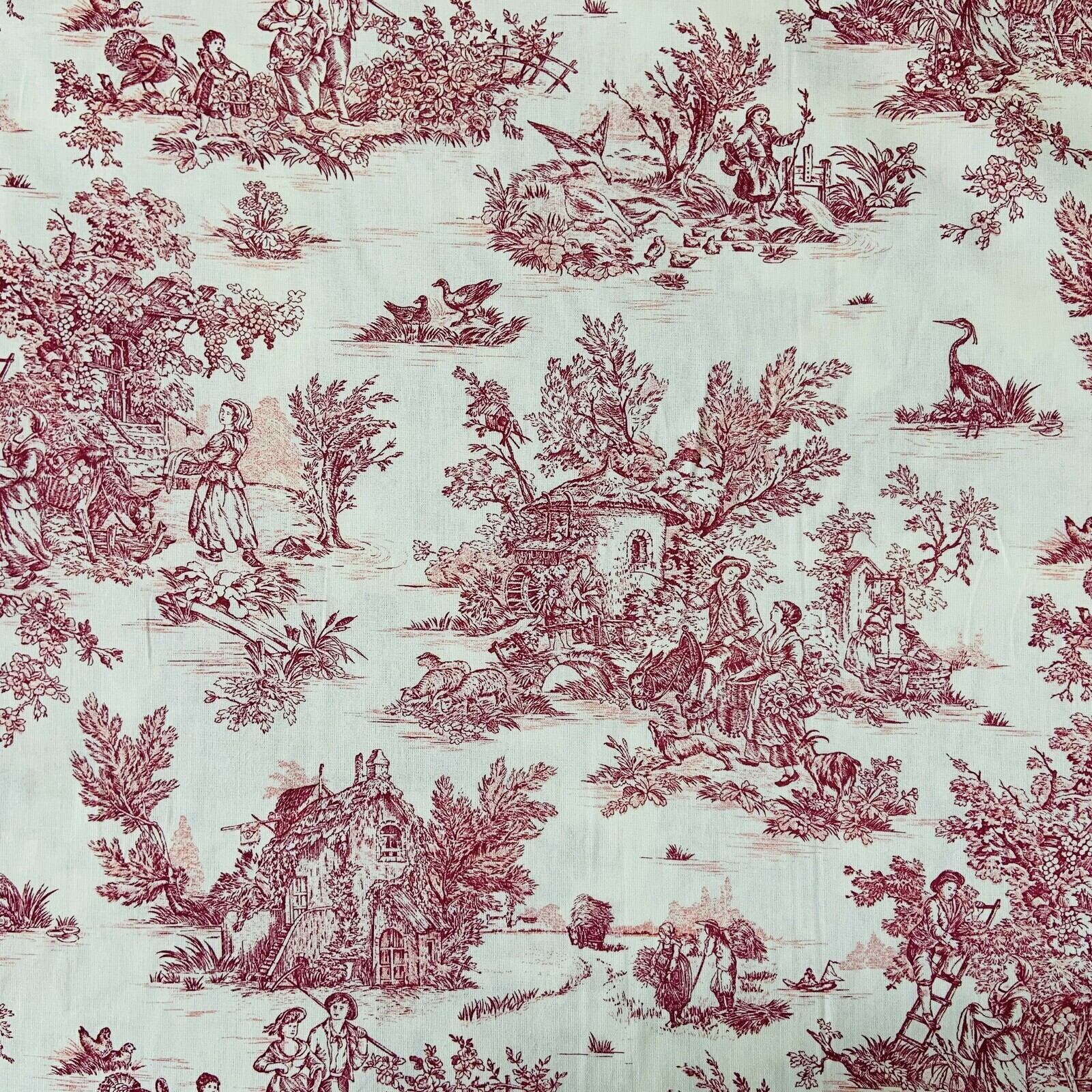 パストラルとは、18世紀ロココ時代に愛された題材で、のどかな田園風景の中、農作業に勤しむ人々や語らう男女を描いた風俗画を指します。ジュイ工場が生み出した単色濃淡で描かれる人物柄プリントにおいても、パストラルは代表的な柄の一つでした。MFTA社の『パストラル』は、その18世紀に愛された田園風俗画柄の雰囲気を伝えるトワル・ド・ジュイらしい魅力あふれる生地です。