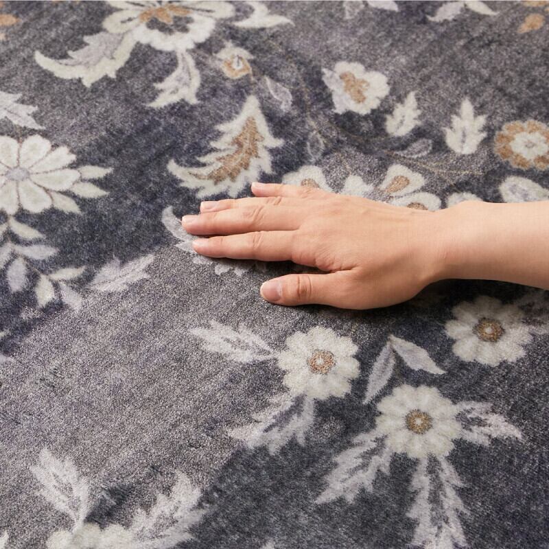 ・裏面は、不織布の上に滑り止め加工を施しています。通常のドット柄の滑り止めに強力な花柄の滑り止めをプラスしています。フローリングの上でも滑りにくく、ラグのズレを軽減してくれます。