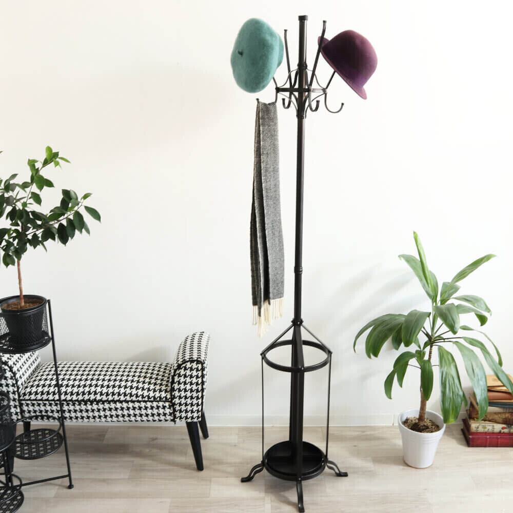 存在感と機能性を兼ね備えたアイアンスタンド式ハンガーラック&傘立てです。