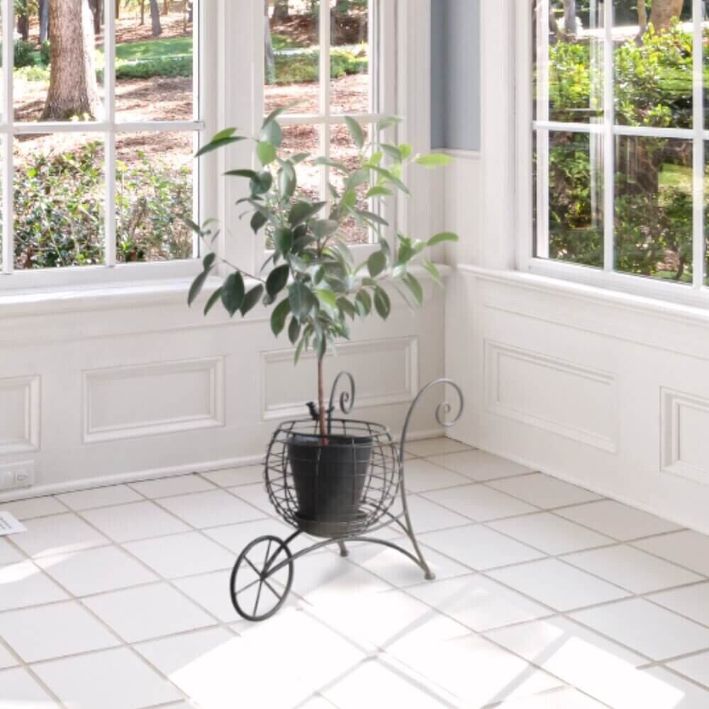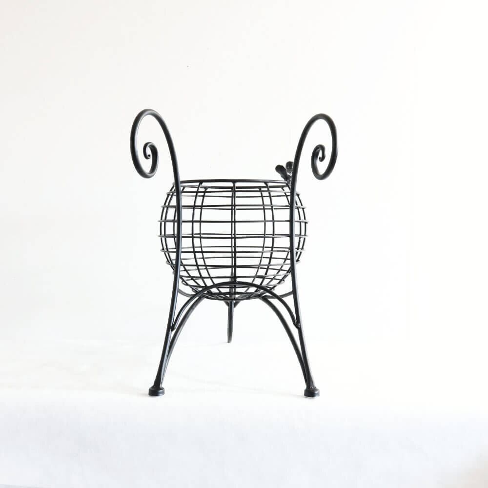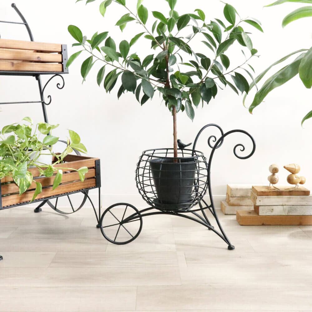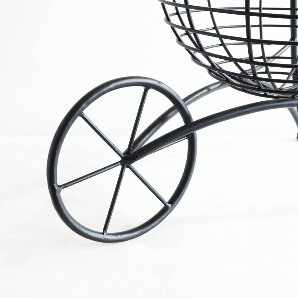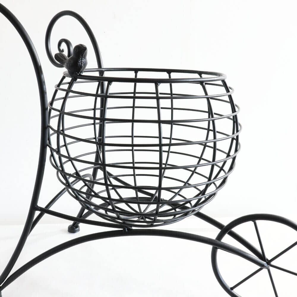 形がとても個性的なアイアン製カート型プランター(鉢カバー)です。