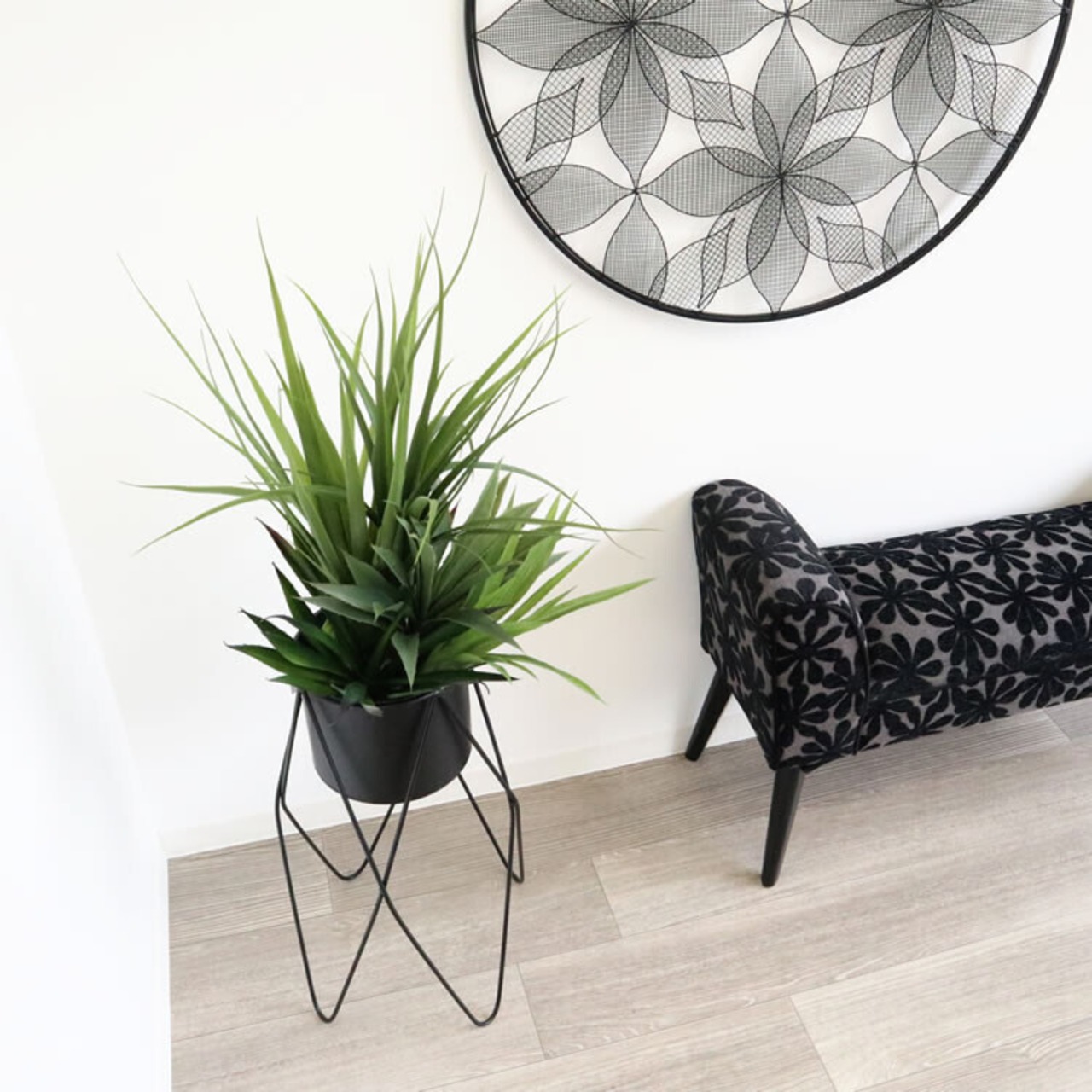 お部屋のコーナーへ鉢カバーごと入れて素敵なグリーンを演出できるスタンド型フラワースタンドです。