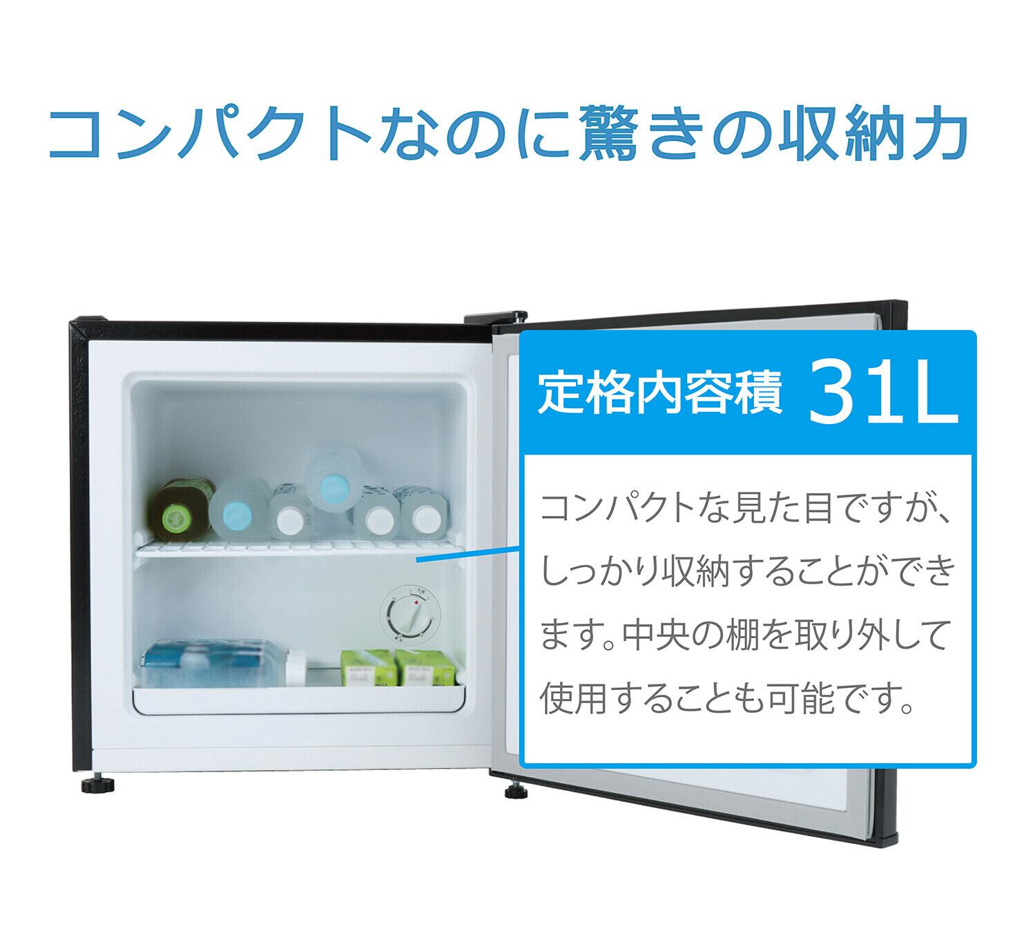 ●31L驚きの収納力、8段階温度調節、耐熱性天板でスペースを有効活用、霜取り用ヘラ・製氷皿付き