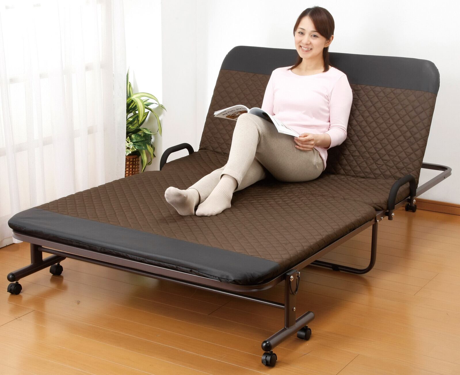 コンパクト収納できる便利なリクライニング仕様のベッド。