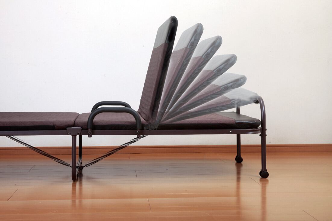 ●本品の自慢はなんといっても片手収納。ベッド脇のアームを持ち上げるだけで、すぐに折りたためるので大変便利。しかもコンパクトに収納できるので場所も取らず、お部屋は広々。さらにワンタッチ式で14段階のリクライニングができるのでお好きな姿勢でくつろげます。
