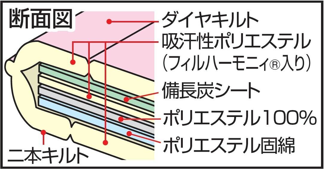 ●素材/[側生地]ポリエステル80%・綿20%、[中身]巻綿:ポリエステル100%(吸汗速乾・抗菌防臭・防ダニわた東洋紡フィルハーモニィ(R)入り)、中芯:ポリエステル100%固綿・備長炭シート入り