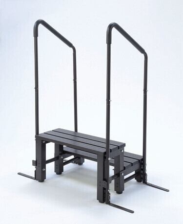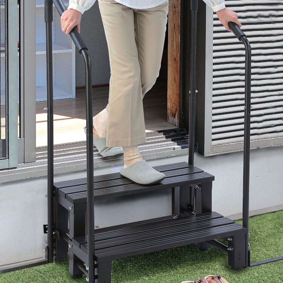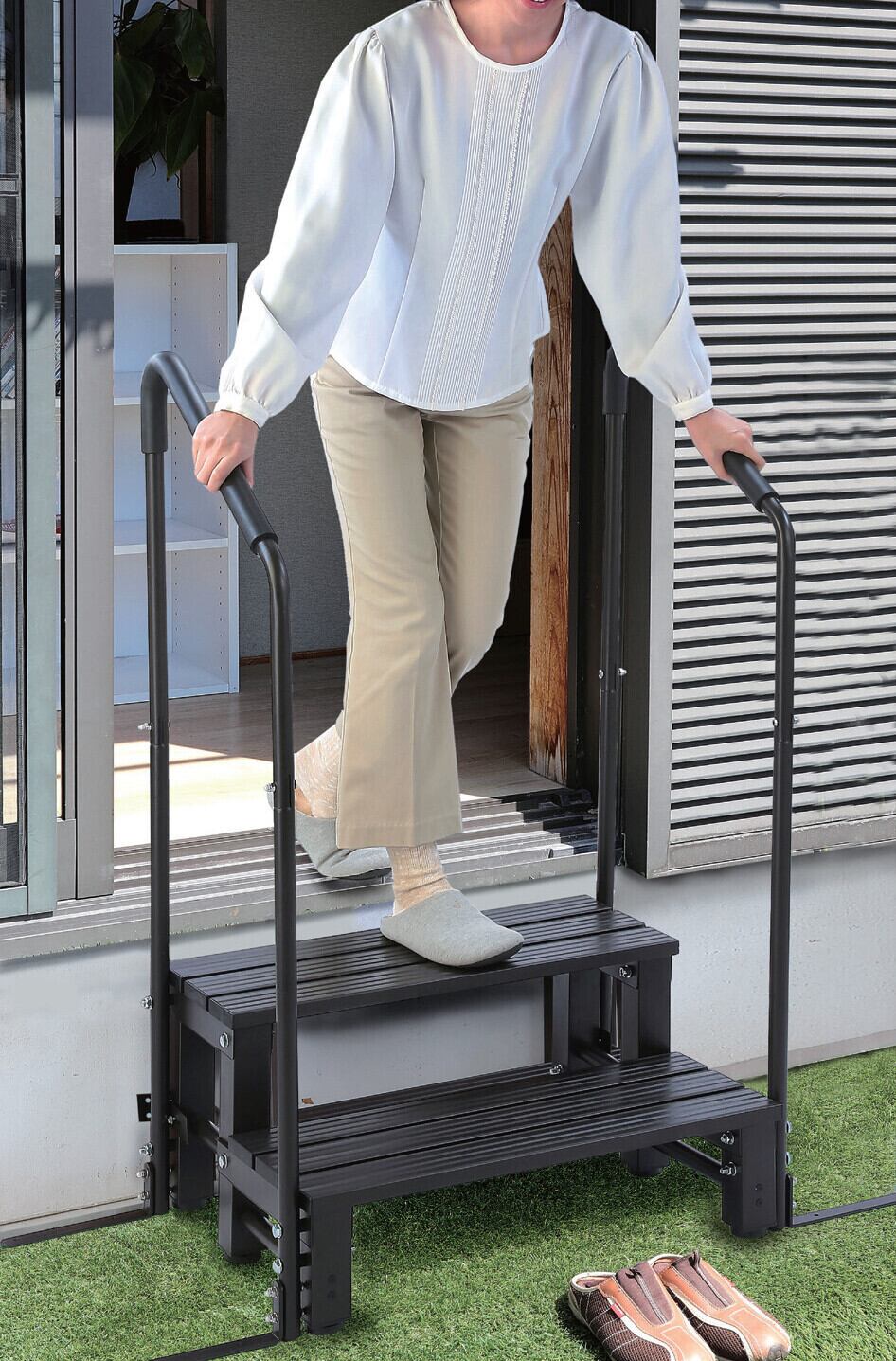 両手すり付きで段差の昇り降りをサポートする2段アルミステップ。