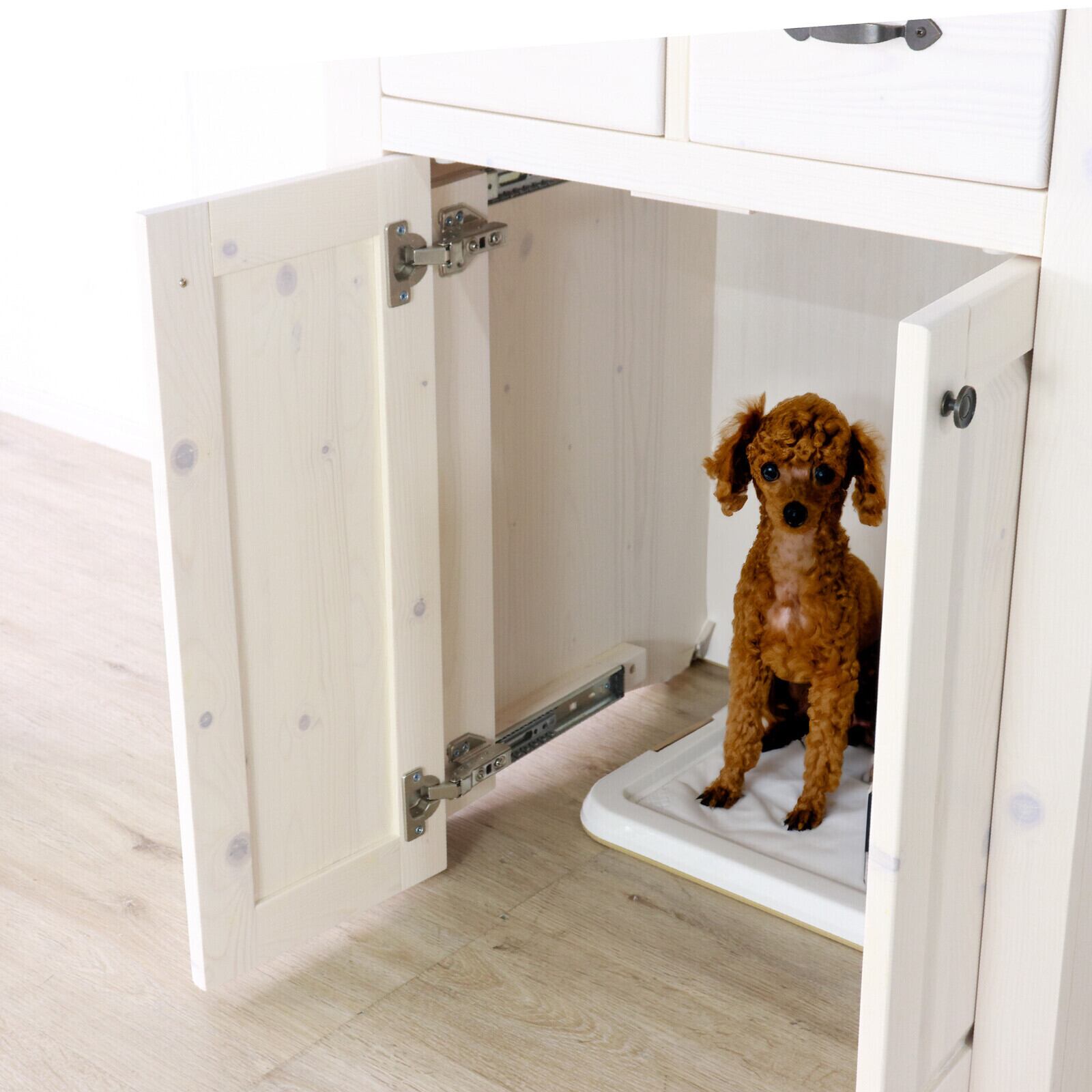 06.下台の扉を開けるとペット用のトイレやごみ箱などが置け、扉を閉めて目隠しすることもできます。また、扉はスライド収納させることができ、開けたまま使用することも可能です。
