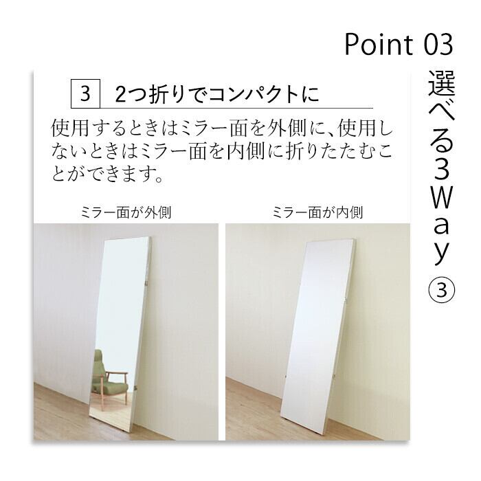 03.ありそうでなかった2つに折れるミラーです。ミラー面を内側・外側どちらにも折りたたむことができます。