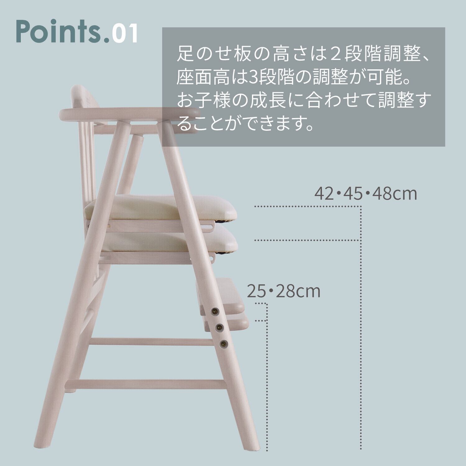 02.座面高は3段階、足のせ板は2段階に調整可能。お子様の成長に合わすことができます。