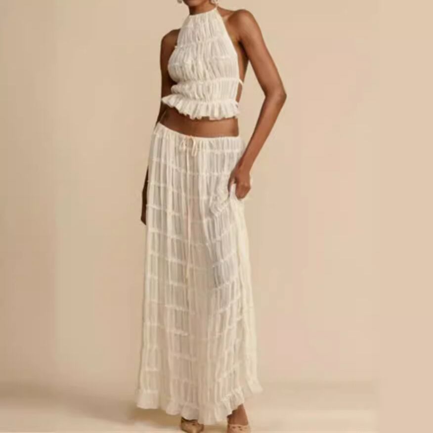 ●「【最新作】クロスボーダースポット2024ホットスタイルプリーツホルターネックサスペンダースカートスーツバックレスレースベストトップロングスカート」は、今年のトレンドを先取りできる洗練されたアイテムです!クロスボーダーとスポット柄の組み合わせが魅力的で、どんなシーンでもスタイリッシュな印象を与えます。