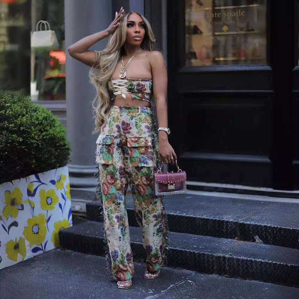 【大人気】 越境ECヨーロッパとアメリカの女性のセクシーなレースアップ胸ラップタッセルパンツレディースジャカードファッションスーツ