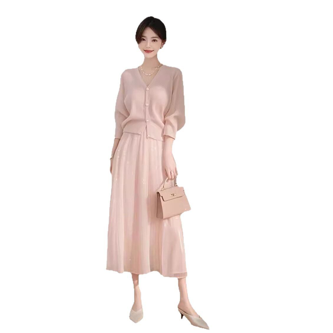 ●この心地よいニットスーツは、柔らかな素材感と独特なピンクの色合いが特徴で、秋の季節にぴったりなスタイルを演出します。長袖のデザインは、温かく快適な着心地を提供し、スカートのフレアラインが女性らしさを引き立てます。どんなトップスとも合わせやすく、カジュアルなお出かけから特別なシーンまで幅広く活躍すること間違いなし!