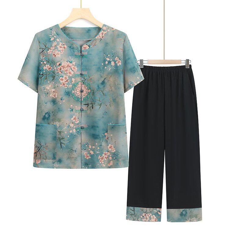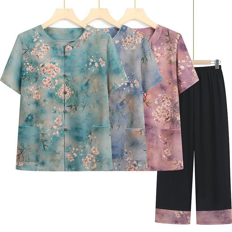 ●大人気の【大人気】おばあちゃんの夏半袖スーツ、中高年女性のためのシャツツーピーススーツは、涼しさと快適さを兼ね備えた理想的な夏のアイテムです!