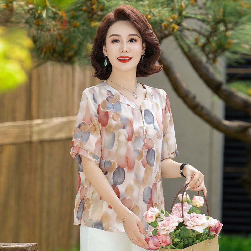 【大人気】中年母親の夏のファッション2025新しい中年婦人服半袖ウエスタンスタイルの小さなシャツレディースシフォンシャツ