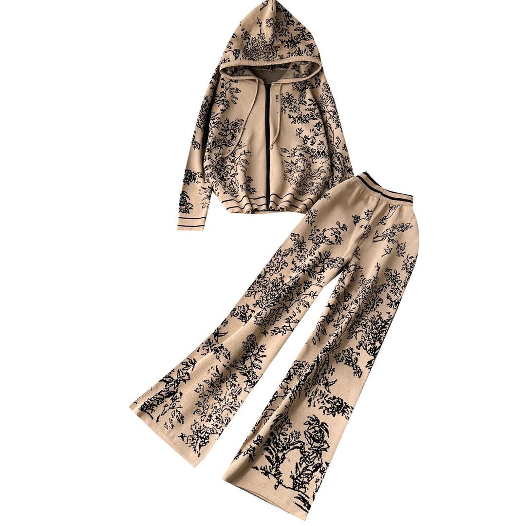 新感覚のカジュアルファッションが実現した、女性用ツーピーススーツが登場!高級プリントのフード付きセーターと、着心地抜群のハイウエストワイドレッグパンツの組み合わせで、年齢を問わずおしゃれを楽しむことができます。スポーティーながらもエレガントさを兼ね備えたデザインが、さらに特別感を演出します。