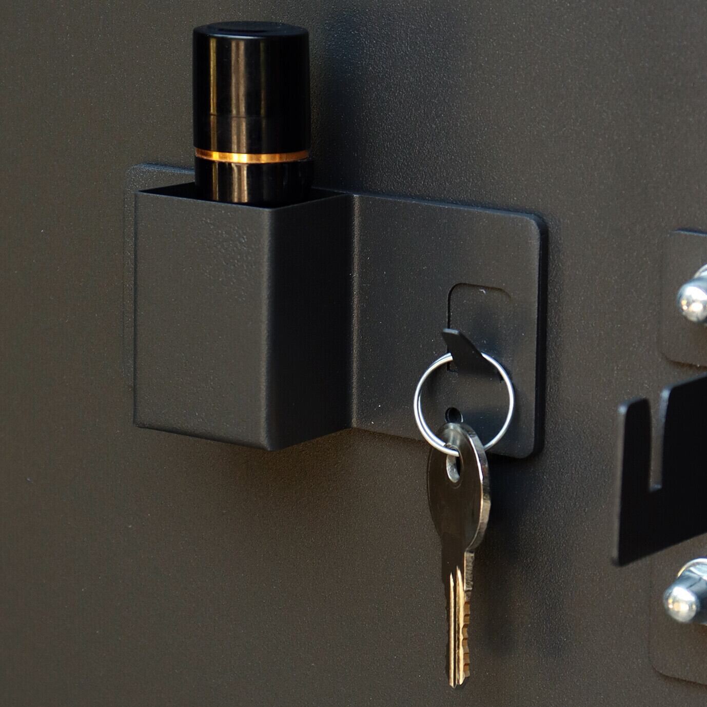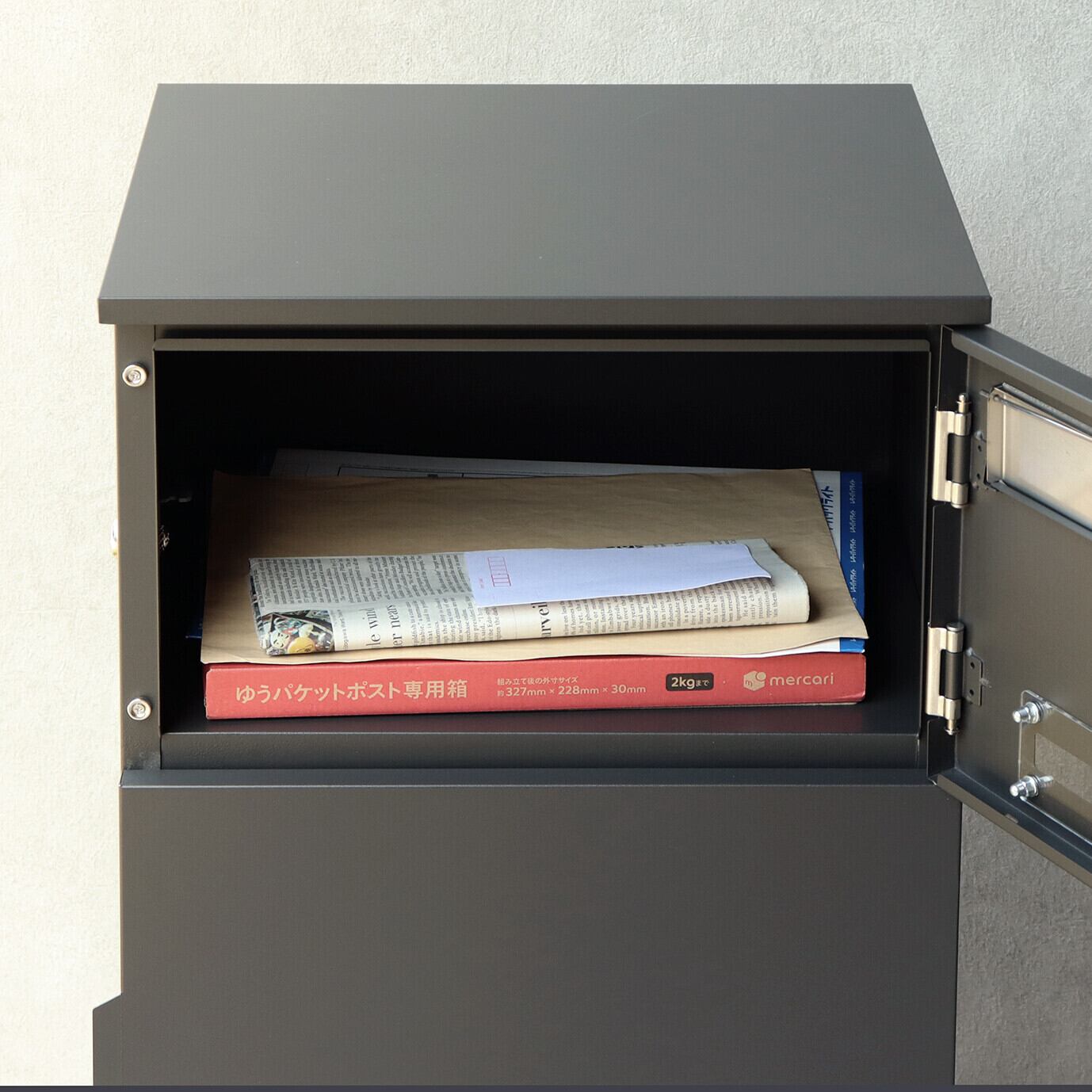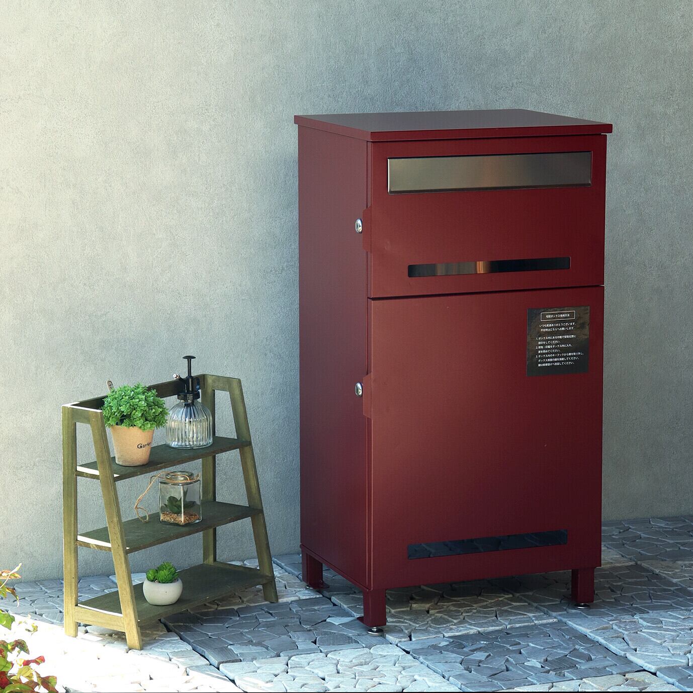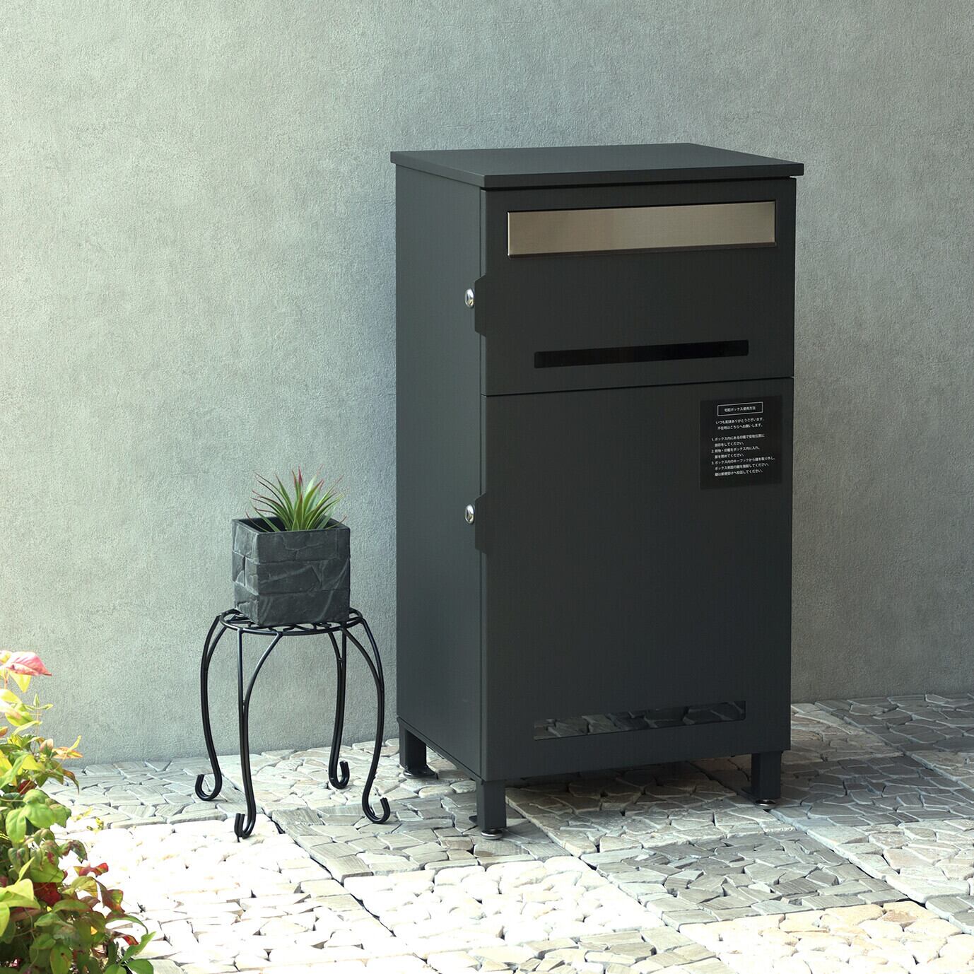 1台の商品で、郵便ポストとしても、宅配ボックスとしても使用可能なアイテムです。上段、下段ともにシリンダー錠付きで、防犯面に安心です。また、スペアキーが2本付属しております(上段、下段ともに)。上段、下段ともに、正面扉下部にスリット窓付きで、扉を開けなくても荷物の確認が可能です。上段の郵便投函口は、ゆうパケットポストや、ネコポスが投函可能です。キー(上段、下段ともに)、アンカーボルト、キーフック付印鑑ケース、宅配業者用の配達マニュアル(マグネット式でお好きな場所に貼付け可)が付属しており、お客様で追加でご用意頂くものは特に必要なく、すぐにご使用頂けます。濃いグレーのディムグレーと、深い赤のボルドーの2色展開になります。ガルバナイズド処理を施しているため、錆びの発生がしにくい仕様となっております。上段の郵便投函口は、ステンレス(SUS316)を使用しており、デザインにアクセントをつけております。宅配可能最大サイズは、約W37.0×D31.8×H42.0cmと、非常に大きな宅配物も配達可能となります。