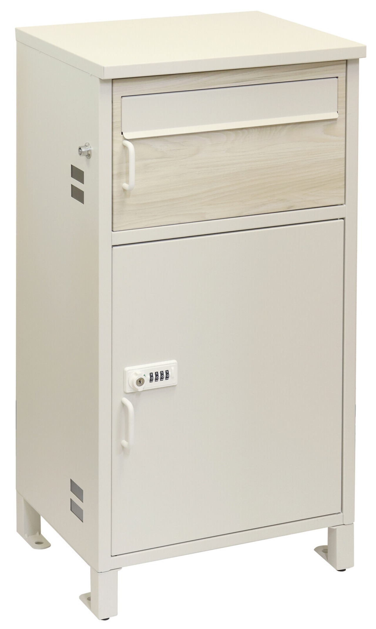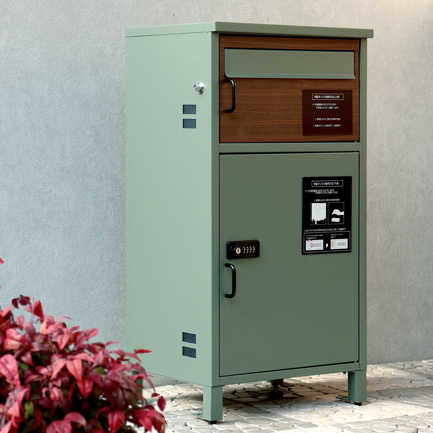 1台の商品で、郵便ポストとしても、宅配ボックスとしても使用可能なアイテムです。上段は、プッシュキーで簡単に鍵の開閉が可能で、防犯面にも安心です。また、スペアキーが1本付属しております。下段は、ダイヤルロックとシリンダー錠(ダイヤル解錠番号が分からなくなった際の緊急用)でドアの開閉が可能です。下段のダイヤルロックは、鍵を施錠した際、鍵を解錠した際にダイヤル番号が"0000"にリセットされ、設定したダイヤル番号の漏洩の心配がありません。上段の郵便投函口は、ゆうパケットポストや、ネコポスが投函可能です。キー(上段用、下段用)、アンカーボルト、キーフック付印鑑ケース×2、宅配業者用の配達マニュアル(マグネット式でお好きな場所に貼付け可)×2(上段用、下段用) が付属しており、お客様で追加でご用意頂くものは特に必要なく、すぐにご使用頂けます。深い緑のエバーグリーンと上段扉がブラウン木目の組み合わせと、くすんだベージュのグレージュと上段扉がホワイト木目の組み合わせの2色よりお選び頂けます。ガルバナイズド処理を施しているため、錆びの発生がしにくい仕様となっております。上段の扉は木目調で、デザインにアクセントをつけております。下段の宅配可能最大サイズは、約W34.0×D30.9×H43.0cmと、非常に大きな宅配物も配達可能となります。印鑑ケースは2個付属しており、上段の鍵もプッシュキーを使用しているので、上段も宅配ボックスとしての使用も可能です。