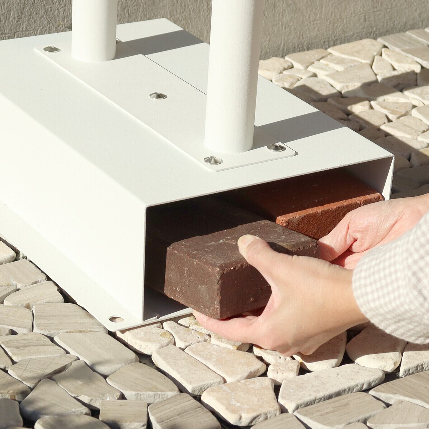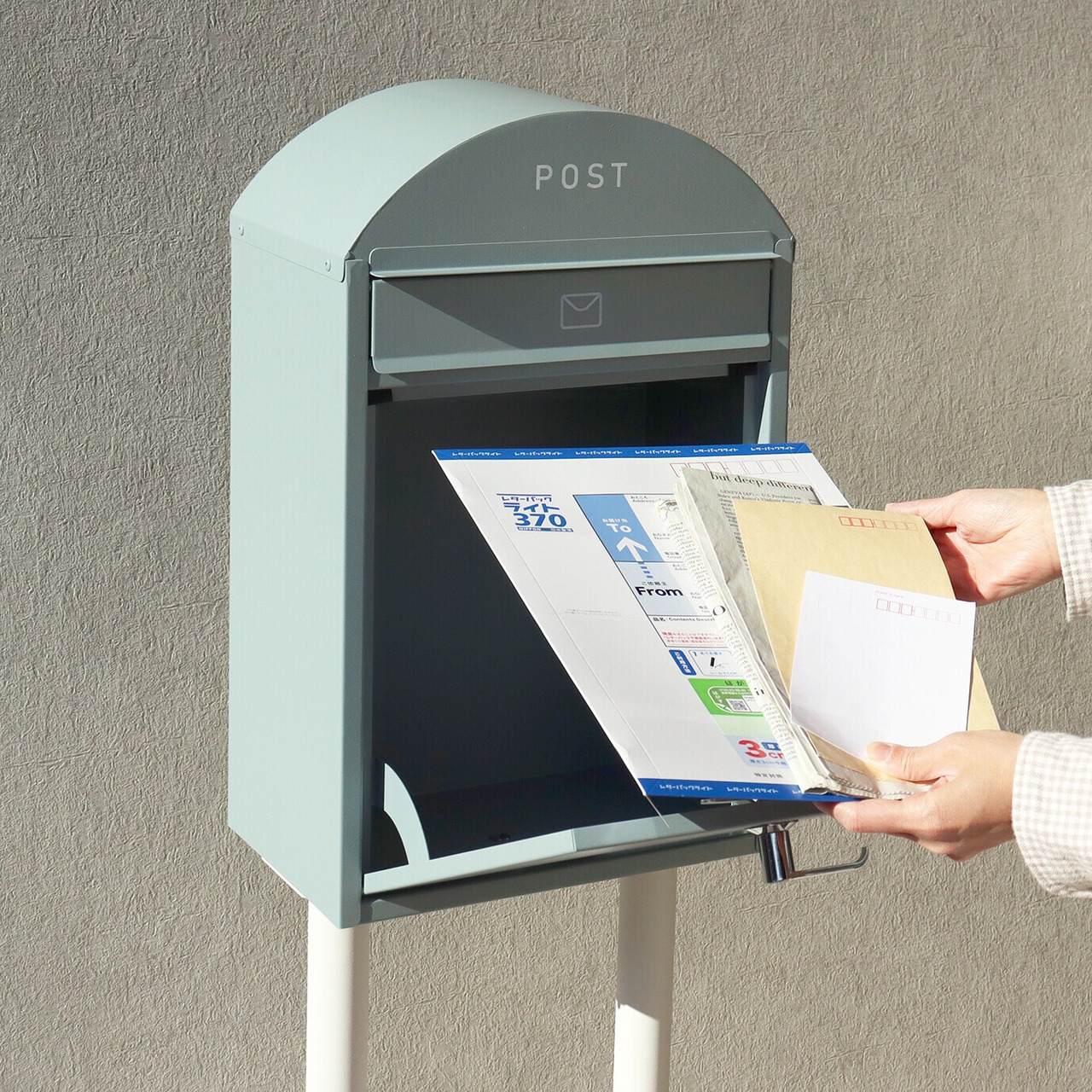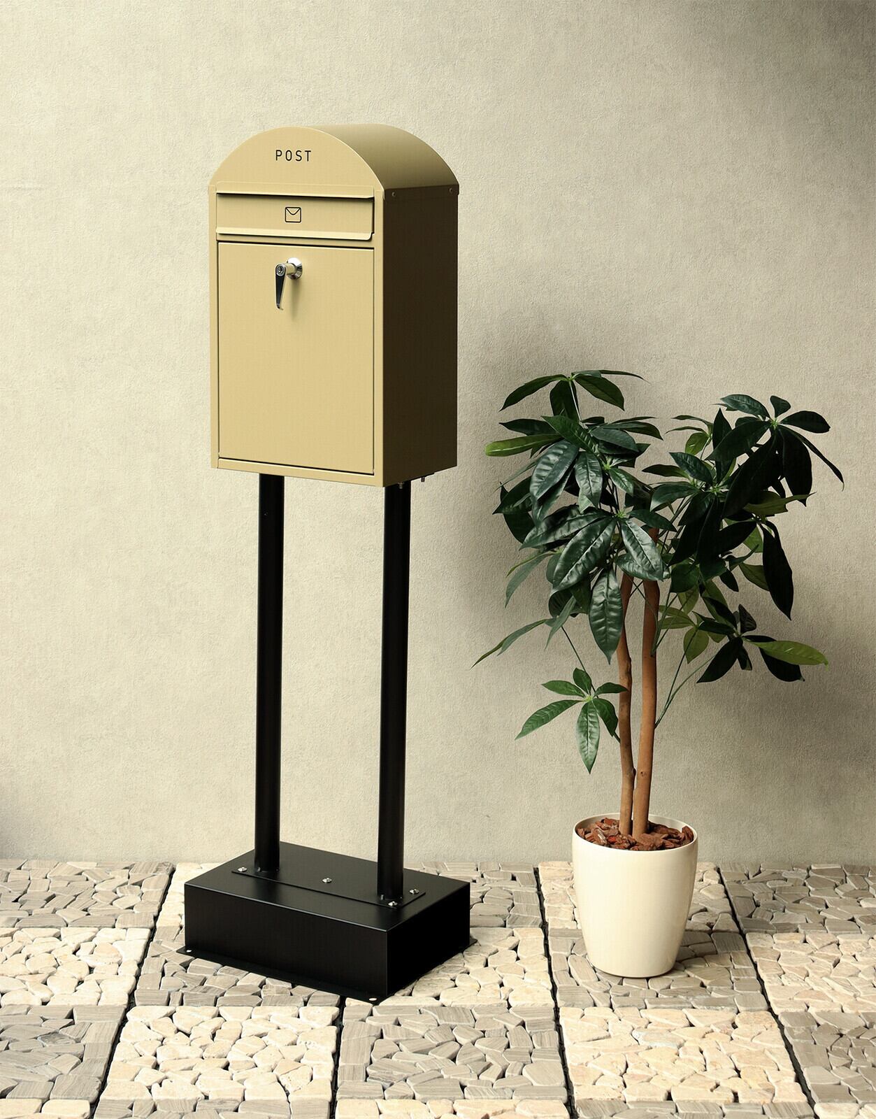 置くだけで使用可能なスタンド式で、壁掛け式とは異なり面倒な施工の手間がかかりません。茶封筒角型2号やレターパックライトが投函可能です。鍵付きなので防犯面に安心です。また、スペアキーが1本付属しています。郵便取出口は、扉が最大約75°くらいまでにしか開かない構造ですので、郵便取出し時に、郵便物落下の心配がありません。土台部は、標準サイズのレンガ(21×10×6cm)を最大3個入れることが可能です(横向き×2、縦向き×1)。キー、アンカーボルトが付属しており、お客様で追加でご用意頂くものはなく、すぐにご使用いただけます。天面はアール形状のデザインで仕上がっており、玄関先を可愛く彩ります。郵便本体が上品な色合いのイエローベージュとブラックの脚と土台の組み合わせと、玄関先を明るく彩るブルーグレーとホワイトの脚と土台の組み合わせの2色での展開になります。"POST"と"✉"のシルク印刷がデザインのワンポイントで、カジュアルな仕上がるのポストになっております。ガルバナイズド処理を施しているため、錆びにくくなっております。地面固定用のアンカーボルトが付属します。土台部にアンカーボルトを打ち込む穴があり、地面とポストを固定することも可能です。