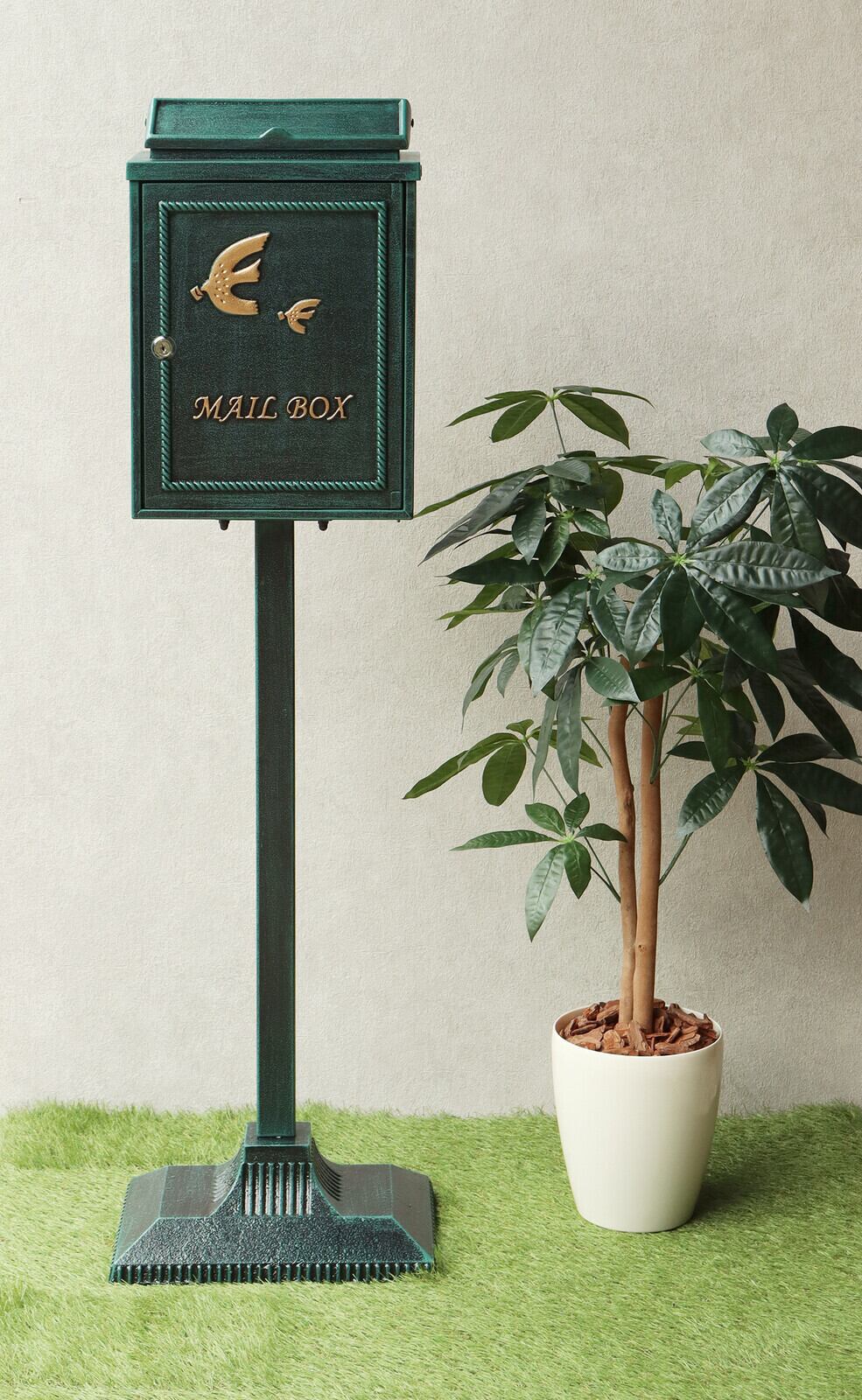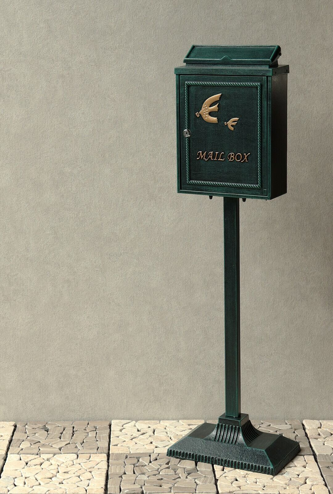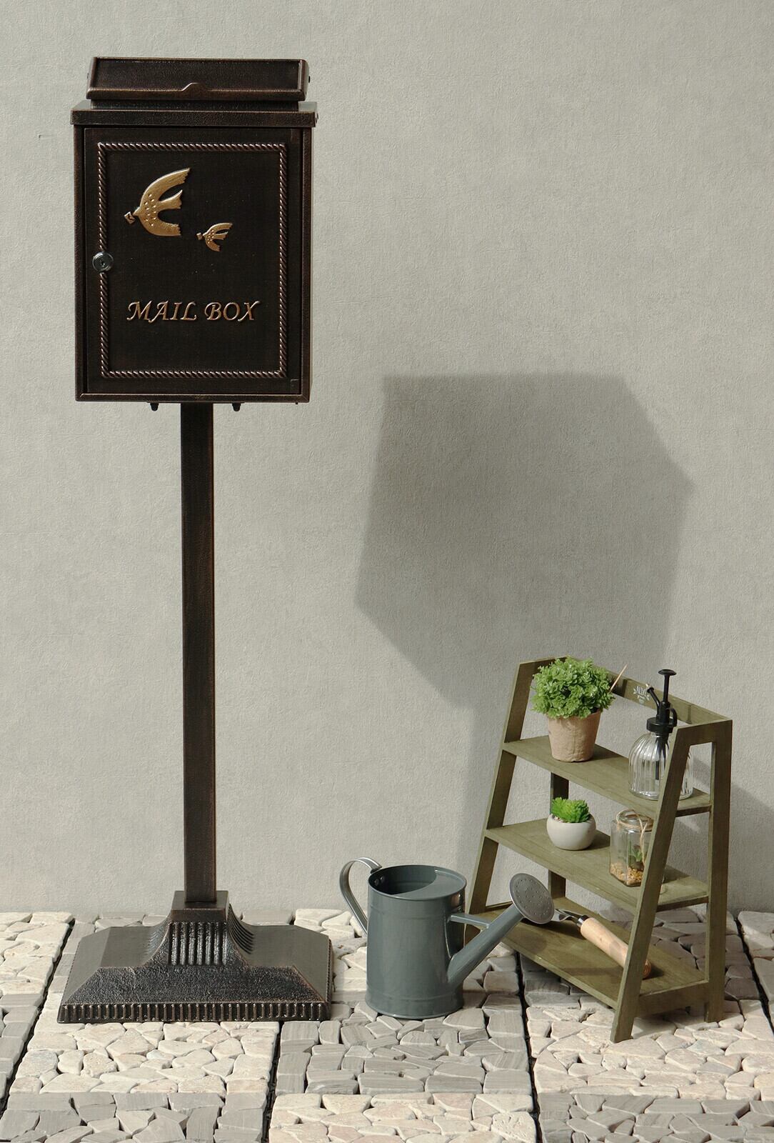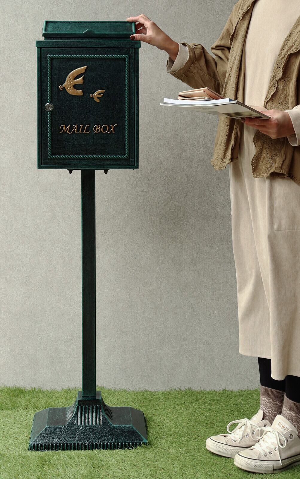 置くだけで使用可能なスタンド式で、壁掛け式とは異なり面倒な施工の手間がかかりません。茶封筒角型2号が投函可能です。鍵付きなので防犯面に安心です。また、スペアキーが1本付属しています。珍しい鋳造加工のポストで、お家の外観にインパクトを与えます。郵便物を運ぶ小鳥の型と、"MAIL BOX"の型がデザインにアクセントを加えております。カラーはブロンズとグリーンよりお選びいただけます。和風、洋風のお家、どちらにもマッチするアンティークカラーです。郵便取り出し口に、郵便物転落防止のストッパー付きで、郵便物を安心して取り出し頂けます。パーツは、郵便入れ本体、脚、台座の3つからなり、組立もシンプルで時間を費やさずに可能です。