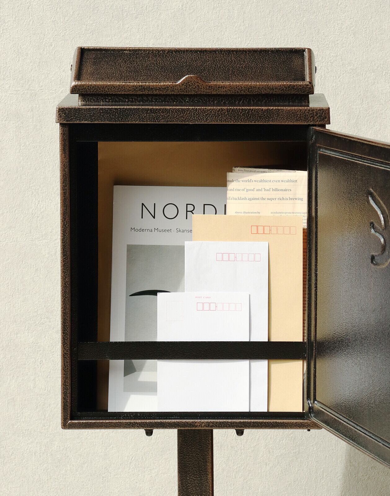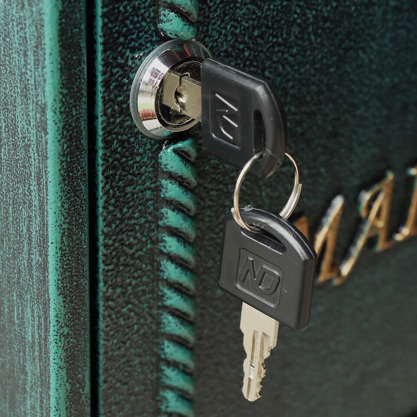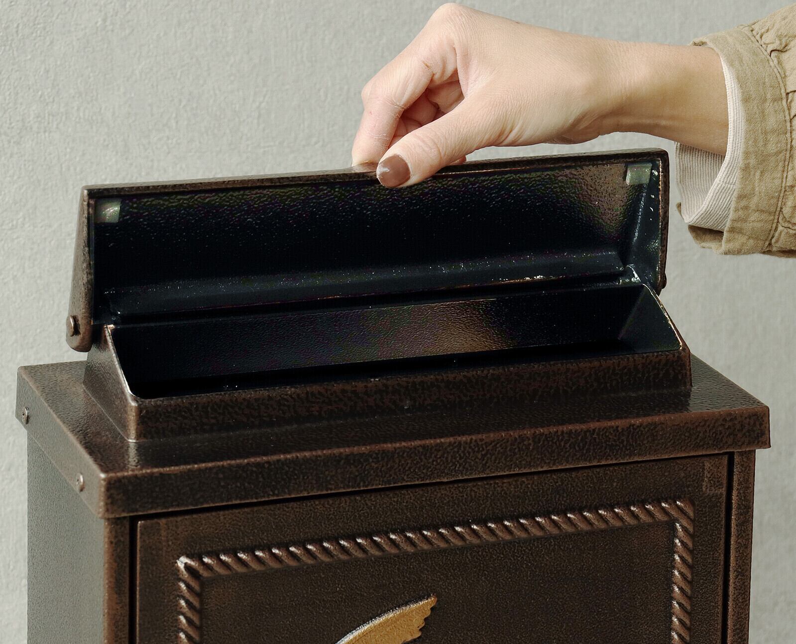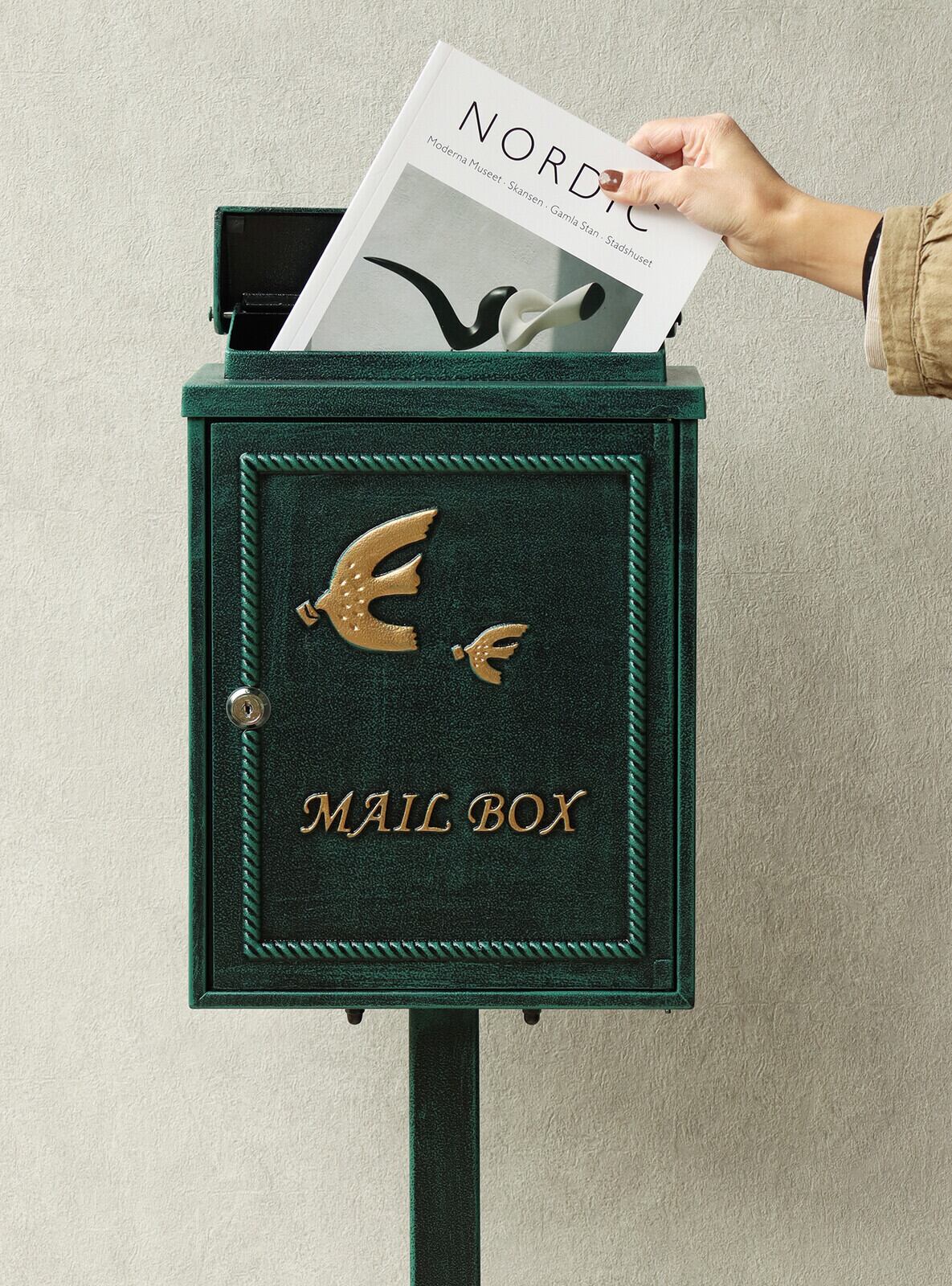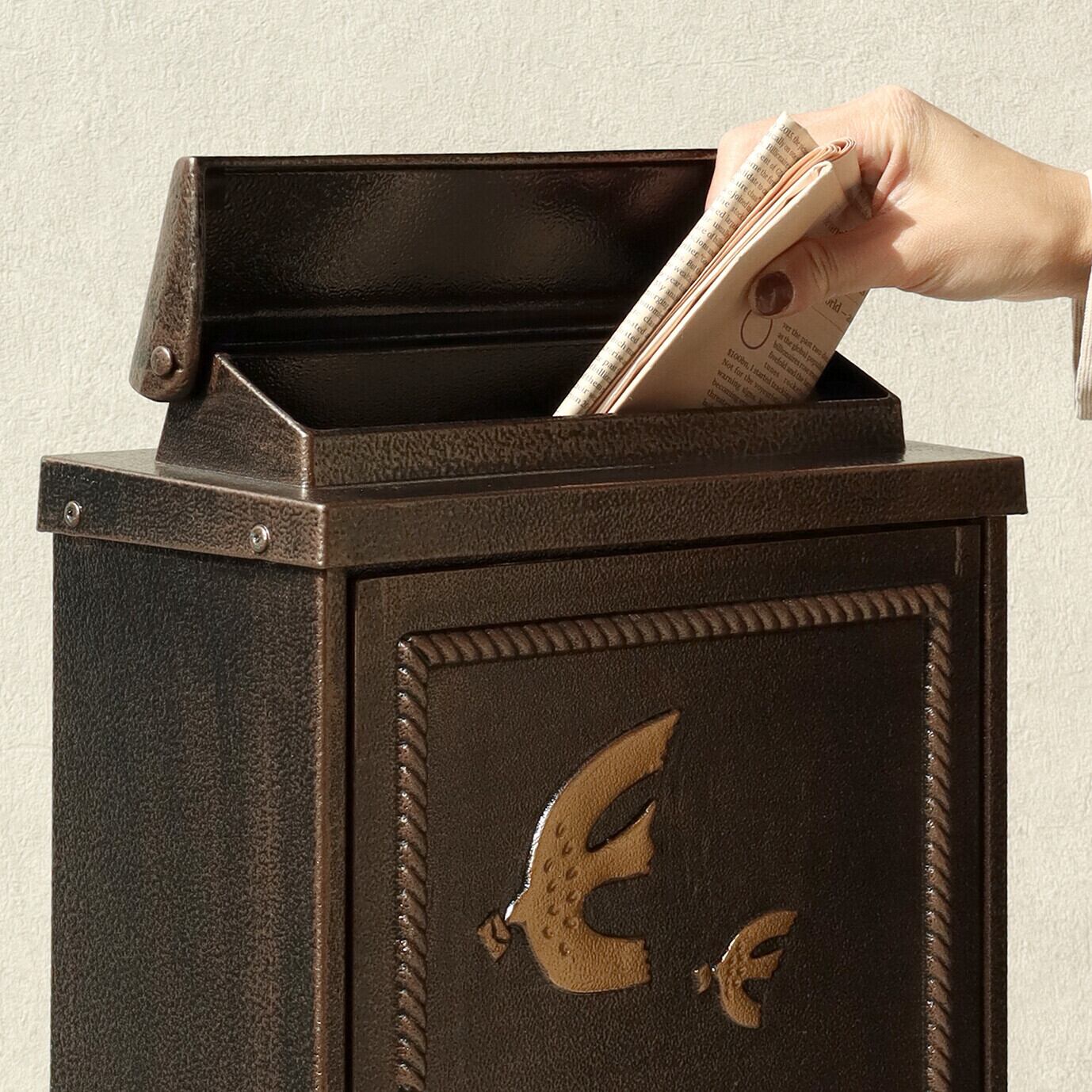 置くだけで使用可能なスタンド式で、壁掛け式とは異なり面倒な施工の手間がかかりません。茶封筒角型2号が投函可能です。鍵付きなので防犯面に安心です。また、スペアキーが1本付属しています。珍しい鋳造加工のポストで、お家の外観にインパクトを与えます。郵便物を運ぶ小鳥の型と、"MAIL BOX"の型がデザインにアクセントを加えております。カラーはブロンズとグリーンよりお選びいただけます。和風、洋風のお家、どちらにもマッチするアンティークカラーです。郵便取り出し口に、郵便物転落防止のストッパー付きで、郵便物を安心して取り出し頂けます。パーツは、郵便入れ本体、脚、台座の3つからなり、組立もシンプルで時間を費やさずに可能です。