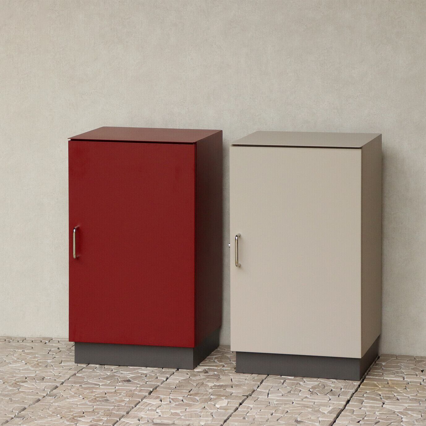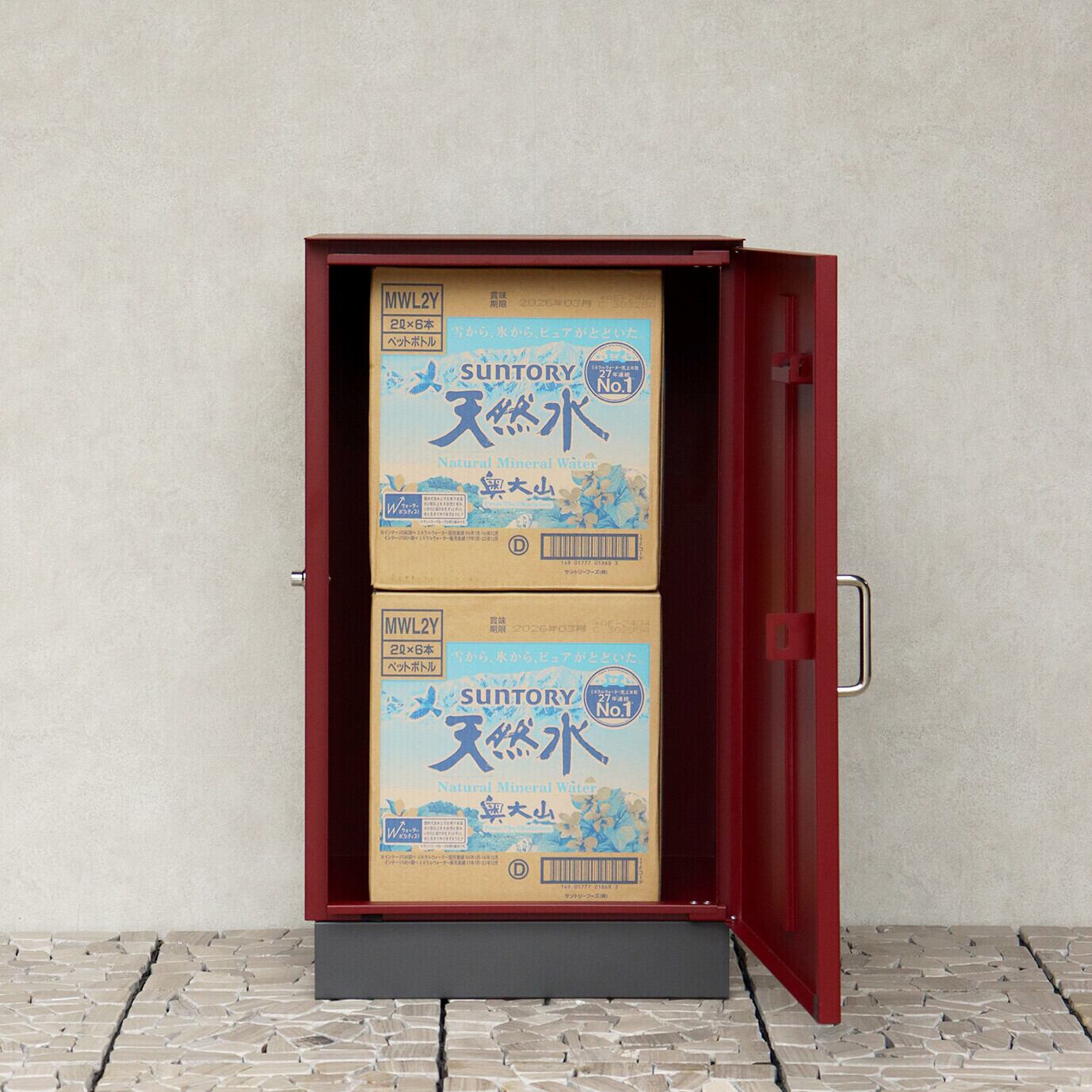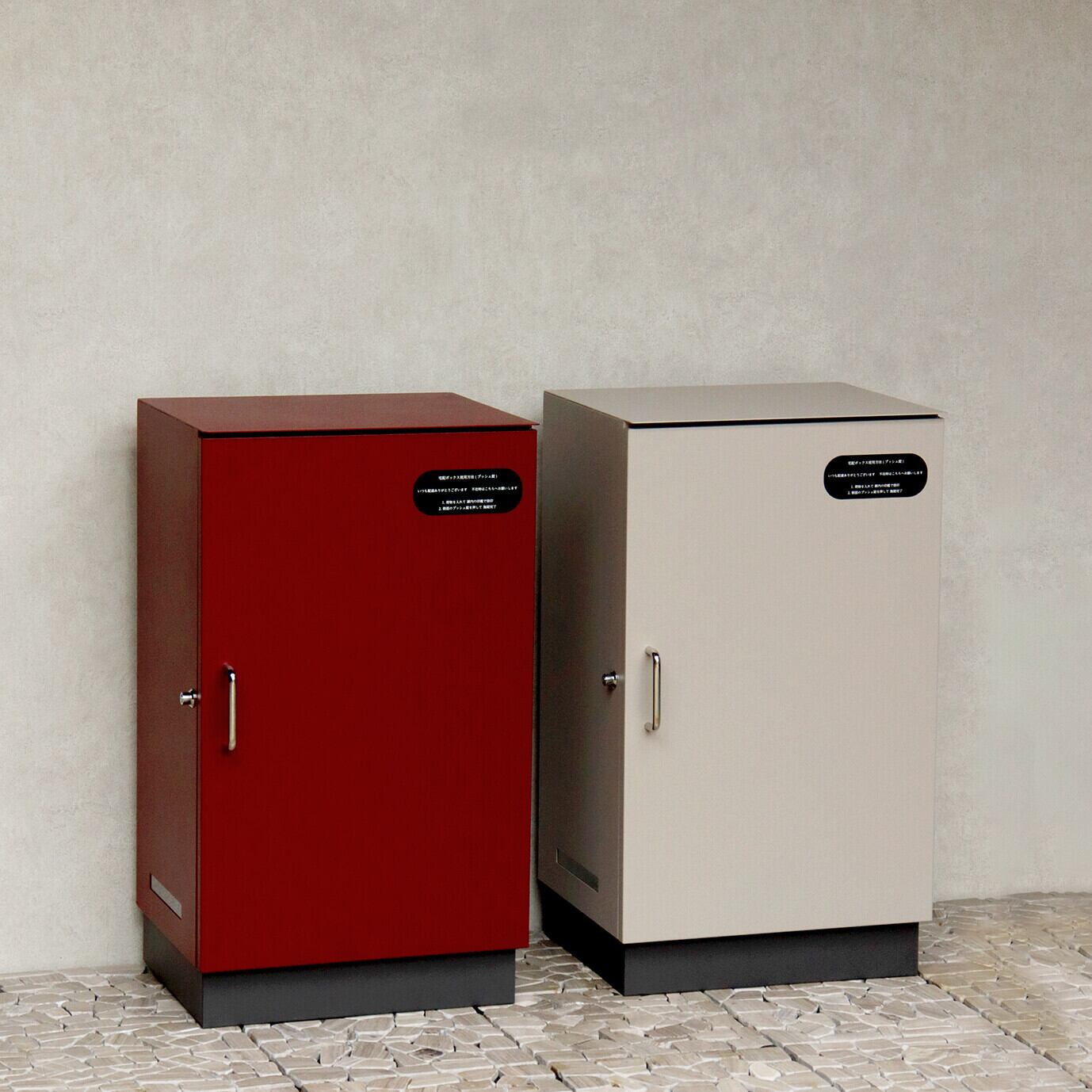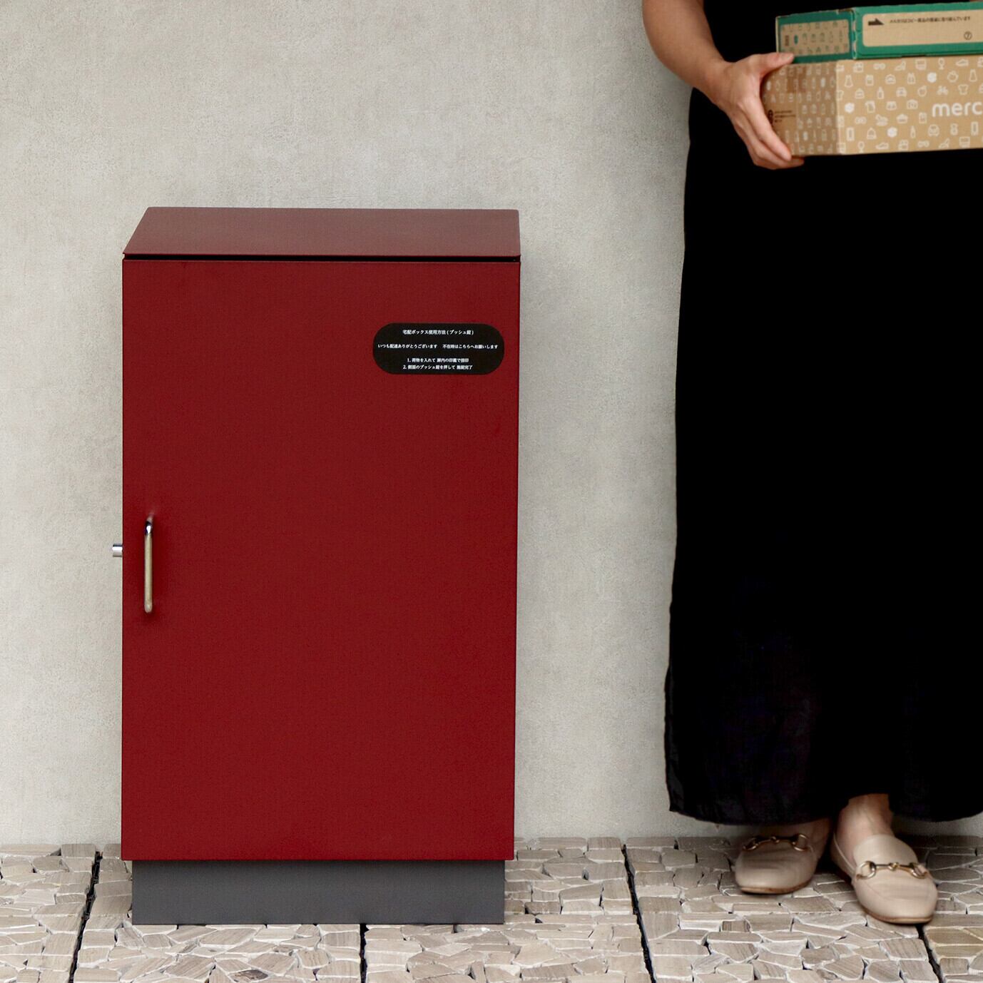 取出口サイズが約W37.3×D32.0×H61.5cmと非常に広く、大きな荷物や同時に複数の荷物の配達が可能な宅配ボックスです。鍵は、プッシュキーで簡単に鍵の開閉が可能で、防犯面にも安心です。また、スペアキーが1本付属しております。向かって左側側面部にスリット窓付きで、扉を開けなくても荷物の確認が可能です。本体と台座で異なる塗装カラーで仕上げており、玄関周りを鮮やかに彩ることのできる商品に仕上がっております。キー、アンカーボルト、キーフック付印鑑ケース、宅配業者用の配達マニュアルが付属しており、お客様で追加でご用意頂くものはなく、すぐにご使用頂けます。本体がボルドー、台座がダークグレーの仕上がりと、本体がライトベージュと、台座がダークグレーの仕上がりの2色展開になります。鏡面仕上げのステンレス製の取っ手を使用しており、デザインのアクセントになっております。「本体」と「台座」のみをボルトで固定する簡易組立の商品となります。台座部は、付属のアンカーボルトでの固定か、台座部にレンガを置き、重しとして固定するかのいずれかになります。扉が1段のみの仕様なり、サイズが大きすぎない宅配ボックスの為、圧迫感がなく設置頂くことが可能です。ガルバナイズド処理を施しているため、錆びの発生がしにくい仕様となっております。