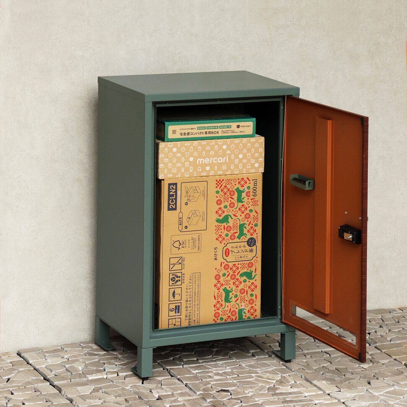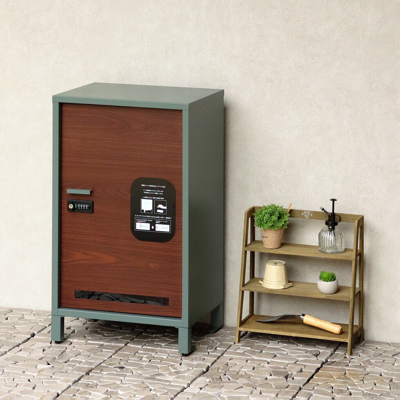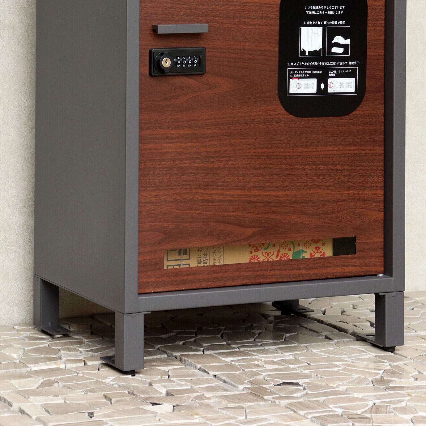 大容量収納:取出口サイズが約W34.8×D29.3×H58.3cmと非常に広く、大きな荷物や同時に複数の荷物の配達が可能な宅配ボックスです。下段は、ダイヤルロックとシリンダー錠(ダイヤル解錠番号が分からなくなった際の緊急用)でドアの開閉が可能です。下段のダイヤルロックは、鍵を施錠した際、鍵を解錠した際にダイヤル番号が"0000"にリセットされ、設定したダイヤル番号の漏洩の心配がありません。扉部は木目で仕上げており、高級感のある仕上がりとなっております。扉正面にスリット窓付きで、扉を開けなくても荷物の確認が可能です。キー、アンカーボルト、キーフック付印鑑ケース、宅配業者用の配達マニュアル(マグネット式でお好きな場所に貼付け可) が付属しており、お客様で追加でご用意頂くものは特に必要なく、すぐにご使用頂けます。 カラーは濃いグレーのダークーグレーとブラウン木目の組み合わせと、落ち着いた緑のフォレストグリーンとブラウン木目の組み合わせからお選び頂けます。「本体」と「脚パーツ」のみをボルトで固定する簡易組立の商品となります。扉部にはシンプルデザインの取っ手付きで、扉の開閉もスムーズに行えます。脚パーツにはアジャスターが付いており、商品のがたつき防止対策を行っております。ガルバナイズド処理を施しているため、錆びの発生がしにくい仕様となっております。