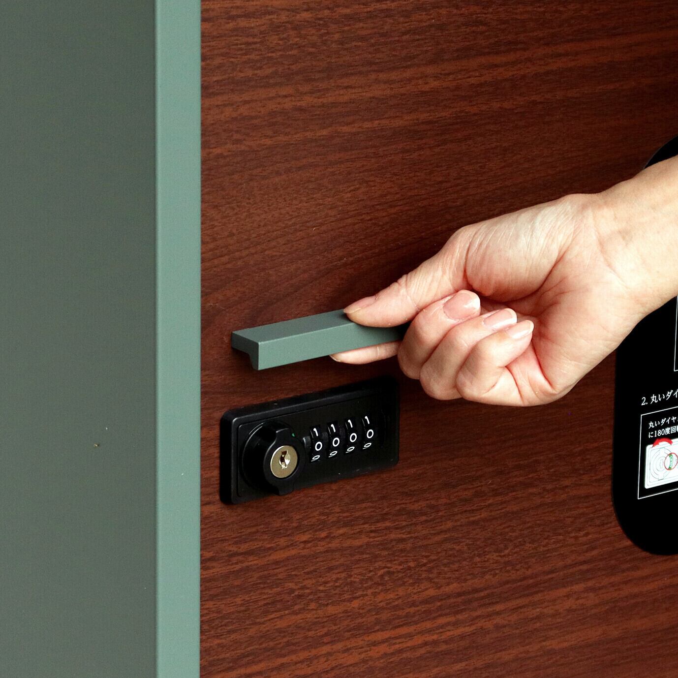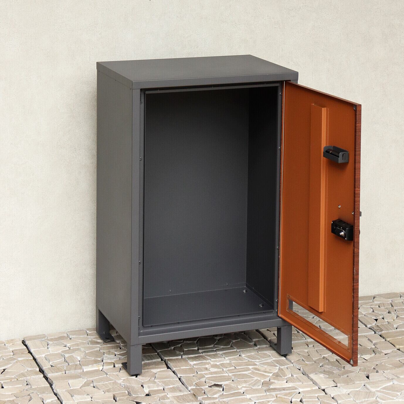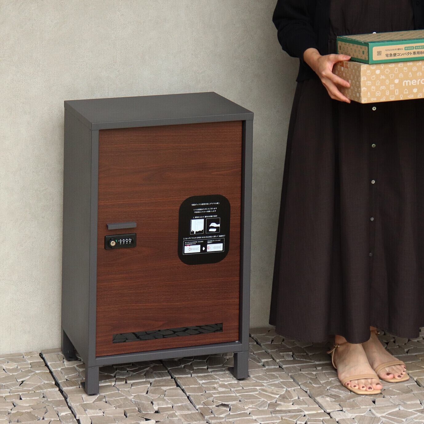 大容量収納:取出口サイズが約W34.8×D29.3×H58.3cmと非常に広く、大きな荷物や同時に複数の荷物の配達が可能な宅配ボックスです。下段は、ダイヤルロックとシリンダー錠(ダイヤル解錠番号が分からなくなった際の緊急用)でドアの開閉が可能です。下段のダイヤルロックは、鍵を施錠した際、鍵を解錠した際にダイヤル番号が"0000"にリセットされ、設定したダイヤル番号の漏洩の心配がありません。扉部は木目で仕上げており、高級感のある仕上がりとなっております。扉正面にスリット窓付きで、扉を開けなくても荷物の確認が可能です。キー、アンカーボルト、キーフック付印鑑ケース、宅配業者用の配達マニュアル(マグネット式でお好きな場所に貼付け可) が付属しており、お客様で追加でご用意頂くものは特に必要なく、すぐにご使用頂けます。 カラーは濃いグレーのダークーグレーとブラウン木目の組み合わせと、落ち着いた緑のフォレストグリーンとブラウン木目の組み合わせからお選び頂けます。「本体」と「脚パーツ」のみをボルトで固定する簡易組立の商品となります。扉部にはシンプルデザインの取っ手付きで、扉の開閉もスムーズに行えます。脚パーツにはアジャスターが付いており、商品のがたつき防止対策を行っております。ガルバナイズド処理を施しているため、錆びの発生がしにくい仕様となっております。