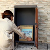 取出口サイズが約W38.8×D30.8×H66.0cmと非常に広く、大きな荷物や同時に複数の荷物の配達が可能な宅配ボックスです。下段は、ダイヤルロックとシリンダー錠(ダイヤル解錠番号が分からなくなった際の緊急用)でドアの開閉が可能です。下段のダイヤルロックは、鍵を施錠した際、鍵を解錠した際にダイヤル番号が"0000"にリセットされ、設定したダイヤル番号の漏洩の心配がありません。扉部は木目で仕上げており、高級感のある仕上がりとなっております。扉正面にスリット窓付きで、扉を開けなくても荷物の確認が可能です。キー、アンカーボルト、キーフック付印鑑ケース、宅配業者用の配達マニュアル(マグネット式でお好きな場所に貼付け可) が付属しており、お客様で追加でご用意頂くものは特に必要なく、すぐにご使用頂けます。カラーは落ち着いたダークーグレー色とブラウン木目の組み合わせと、お家の外壁に合わせやすいグレージュ色とホワイト木目の組み合わせからお選び頂けます。「本体」と「脚パーツ」のみをボルトで固定する簡易組立の商品となります。扉部にはシンプルデザインの取っ手付きで、扉の開閉もスムーズに行えます。脚パーツにはアジャスターが付いており、商品のがたつき防止対策を行っております。ガルバナイズド処理を施しているため、錆びの発生がしにくい仕様となっております。